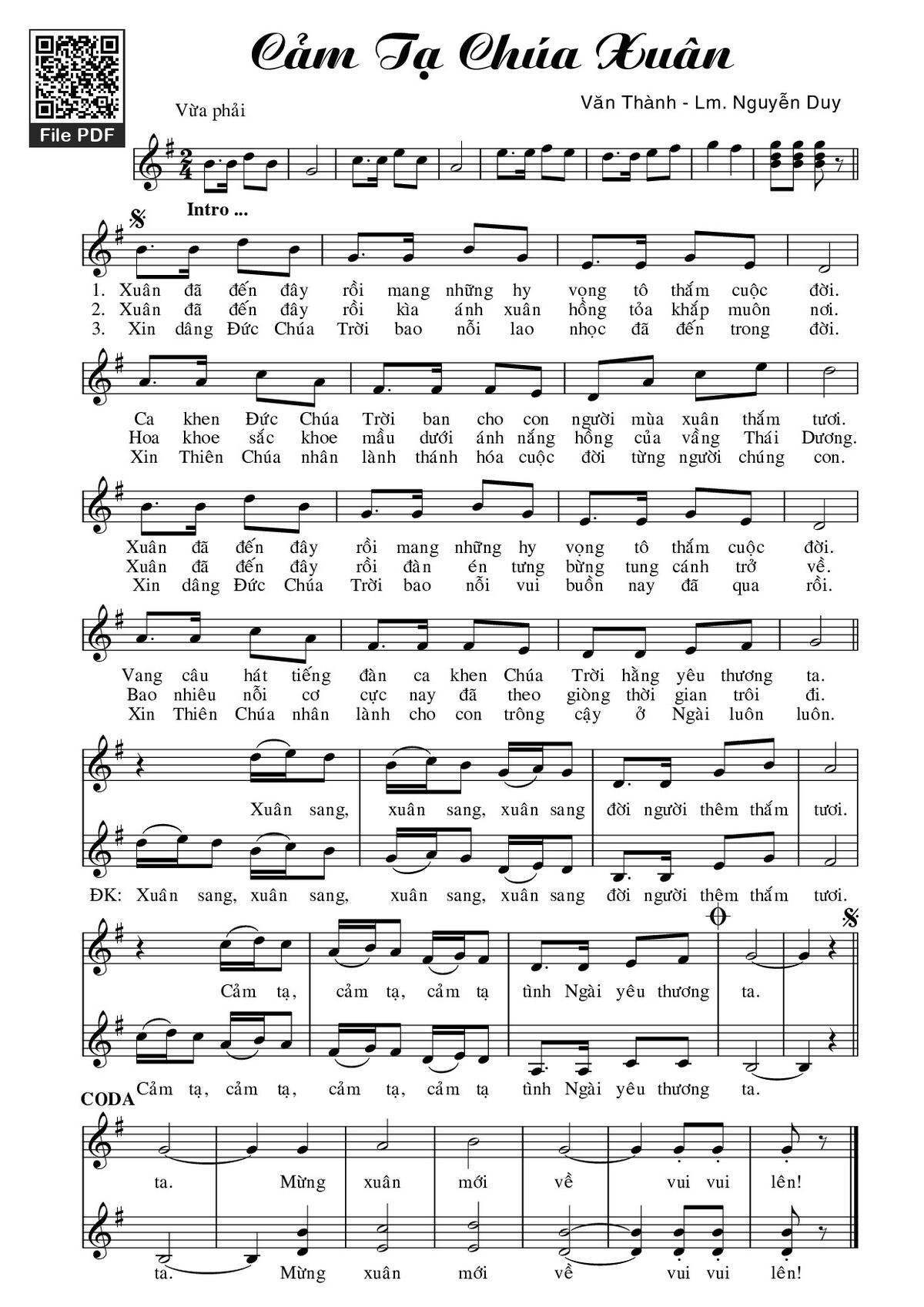 Sheet nhạc có nốt Cảm tạ Chúa Xuân của nhạc sĩ Văn Thành và file PDF nốt nhạc đăng lên đây nhằm giúp các bạn xướng âm cho đúng nốt và hát thêm hay, chỉ mang tính chất tham khảo, không có mục đích thương mại. Bản quyền thuộc về tác giả và tổ chức nắm bản quyền, Truongca.com không giữ bất kỳ bản quyền của nội dung nào cả. Các bạn có thể tải về bản PDF chất lượng cao, gồm khuông nhạc có nốt với đường link file PDF bên trên.