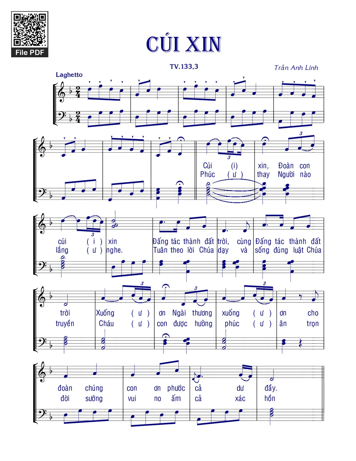 Sheet nhạc có nốt Cúi xin (Tv. 133) của nhạc sĩ Trần Anh Linh và file PDF nốt nhạc đăng lên đây nhằm giúp các bạn xướng âm cho đúng nốt và hát thêm hay, chỉ mang tính chất tham khảo, không có mục đích thương mại. Bản quyền thuộc về tác giả và tổ chức nắm bản quyền, Truongca.com không giữ bất kỳ bản quyền của nội dung nào cả. Các bạn có thể tải về bản PDF chất lượng cao, gồm khuông nhạc có nốt với đường link file PDF bên trên.