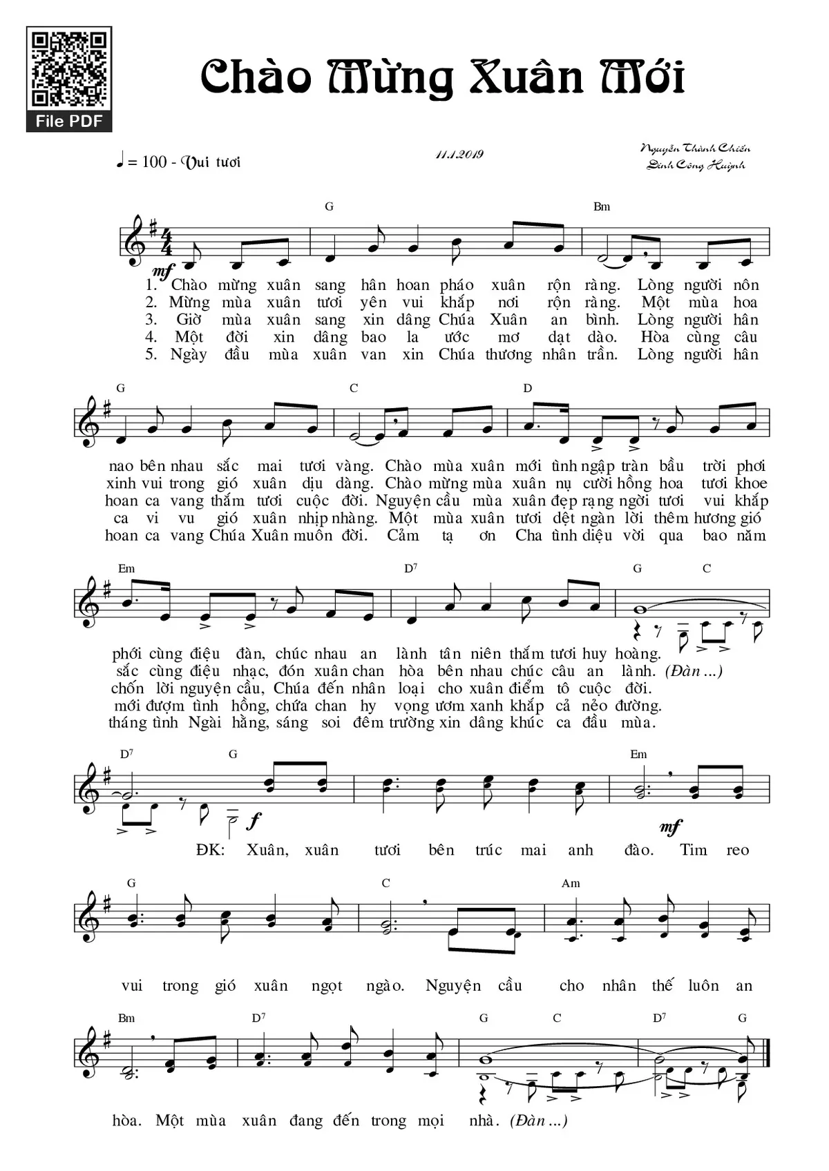 Sheet Chào mừng xuân mới PDF (Nguyễn Thành Chiến), hợp âm