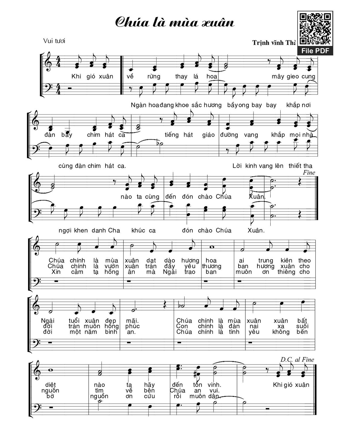 Sheet nhạc có nốt Chúa là mùa xuân của nhạc sĩ Trịnh Vĩnh Thành và file PDF nốt nhạc đăng lên đây nhằm giúp các bạn xướng âm cho đúng nốt và hát thêm hay, chỉ mang tính chất tham khảo, không có mục đích thương mại. Bản quyền thuộc về tác giả và tổ chức nắm bản quyền, Truongca.com không giữ bất kỳ bản quyền của nội dung nào cả. Các bạn có thể tải về bản PDF chất lượng cao, gồm khuông nhạc có nốt với đường link file PDF bên trên.