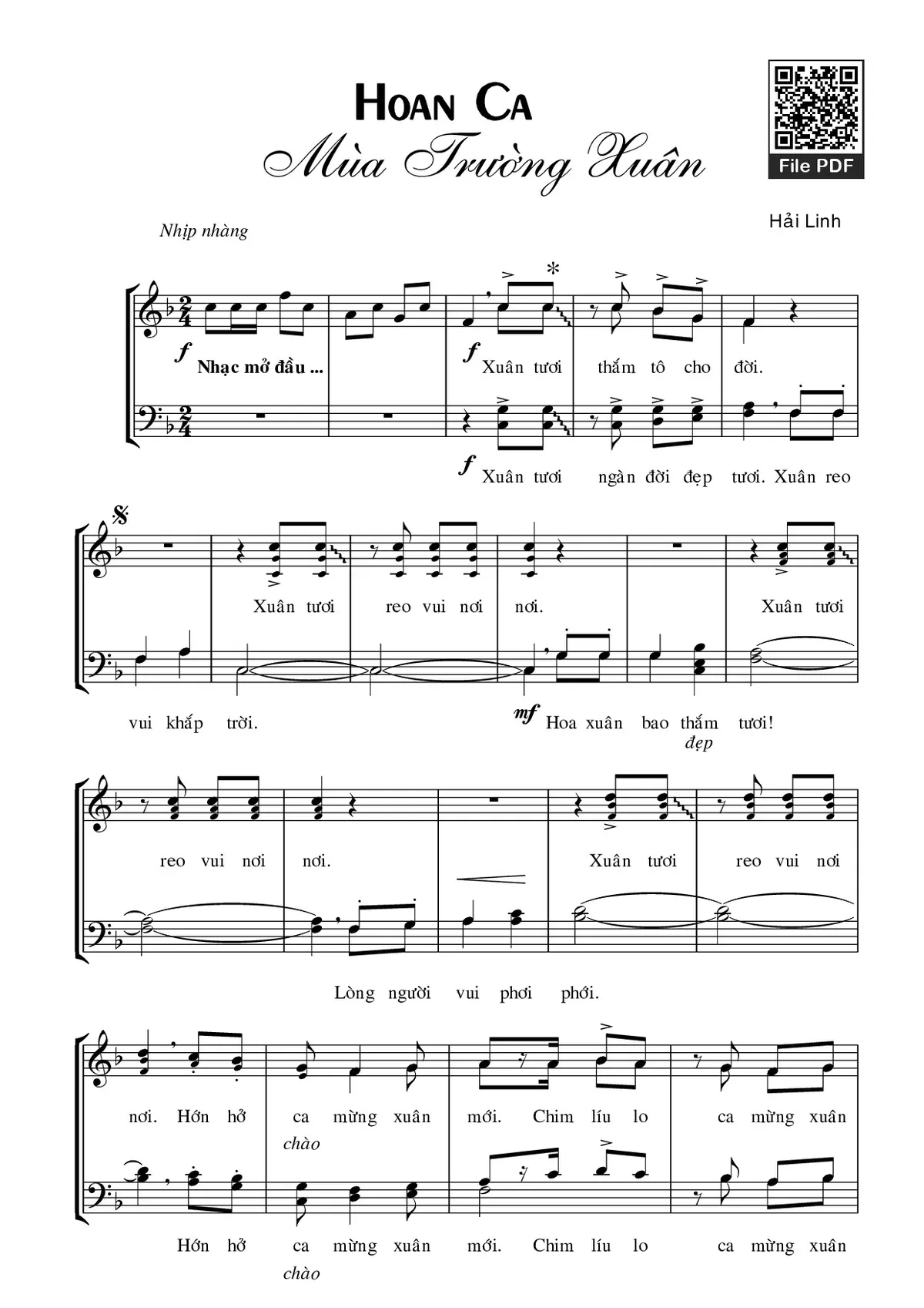 Sheet nhạc có nốt Hoan ca mùa trường xuân của nhạc sĩ Hải Linh và file PDF nốt nhạc đăng lên đây nhằm giúp các bạn xướng âm cho đúng nốt và hát thêm hay, chỉ mang tính chất tham khảo, không có mục đích thương mại. Bản quyền thuộc về tác giả và tổ chức nắm bản quyền, Truongca.com không giữ bất kỳ bản quyền của nội dung nào cả. Các bạn có thể tải về bản PDF chất lượng cao, gồm khuông nhạc có nốt với đường link file PDF bên trên.