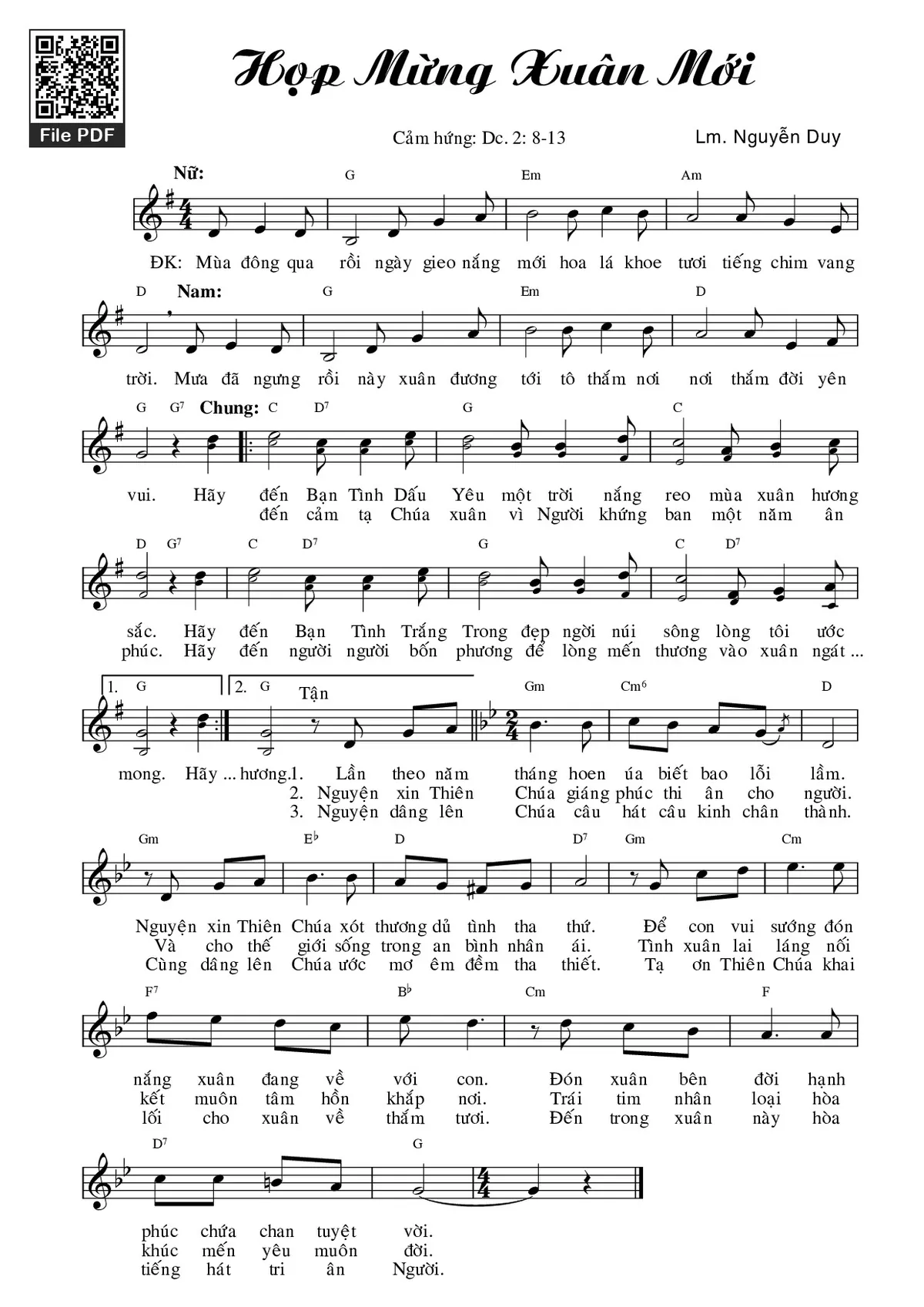 Sheet nhạc có nốt Họp mừng xuân mới của nhạc sĩ Nguyễn Duy và file PDF nốt nhạc đăng lên đây nhằm giúp các bạn xướng âm cho đúng nốt và hát thêm hay, chỉ mang tính chất tham khảo, không có mục đích thương mại. Bản quyền thuộc về tác giả và tổ chức nắm bản quyền, Truongca.com không giữ bất kỳ bản quyền của nội dung nào cả. Các bạn có thể tải về bản PDF chất lượng cao, gồm khuông nhạc có nốt với đường link file PDF bên trên.