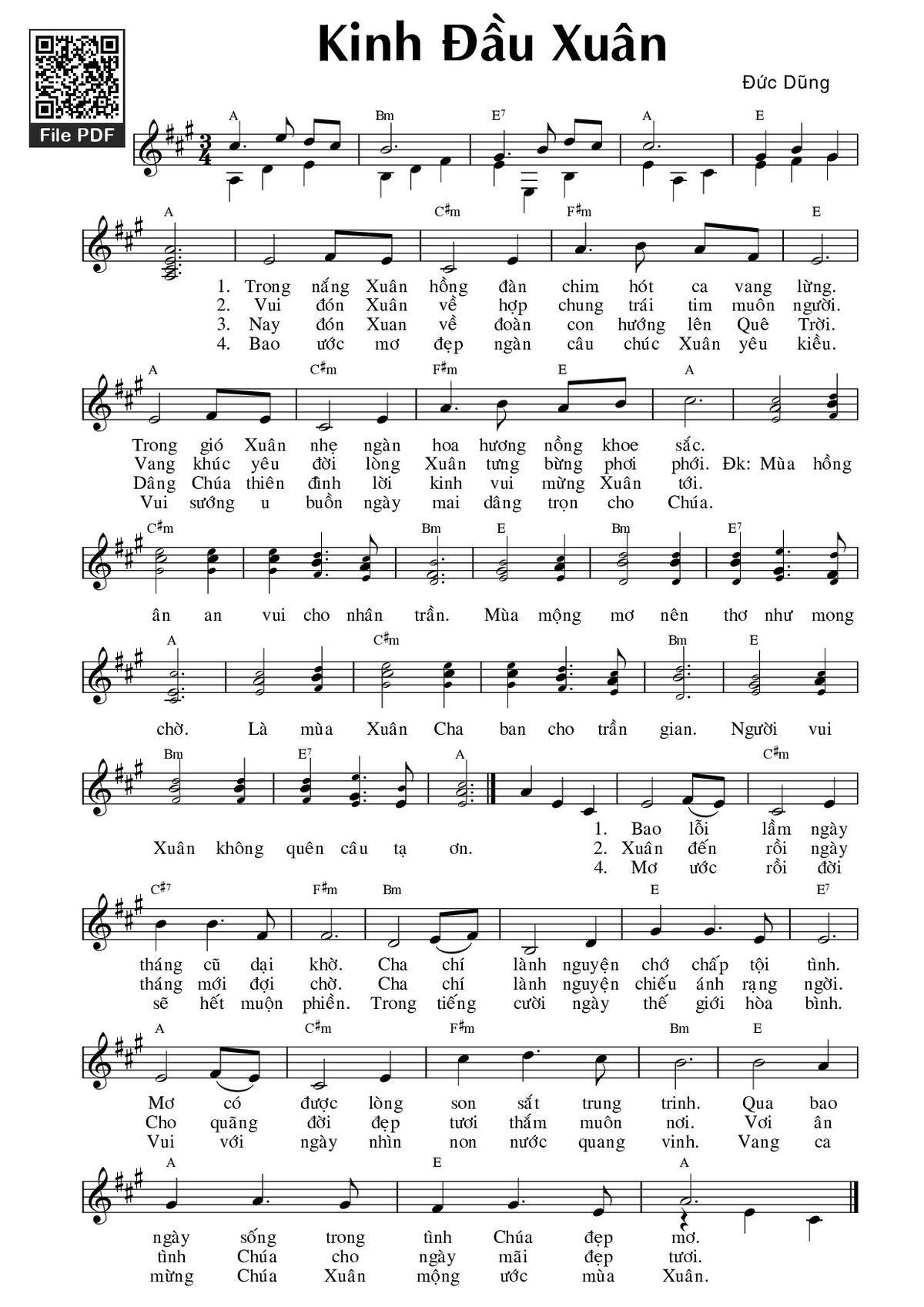 Sheet nhạc có nốt Kinh đầu xuân của nhạc sĩ Đức Dũng và file PDF nốt nhạc đăng lên đây nhằm giúp các bạn xướng âm cho đúng nốt và hát thêm hay, chỉ mang tính chất tham khảo, không có mục đích thương mại. Bản quyền thuộc về tác giả và tổ chức nắm bản quyền, Truongca.com không giữ bất kỳ bản quyền của nội dung nào cả. Các bạn có thể tải về bản PDF chất lượng cao, gồm khuông nhạc có nốt với đường link file PDF bên trên.