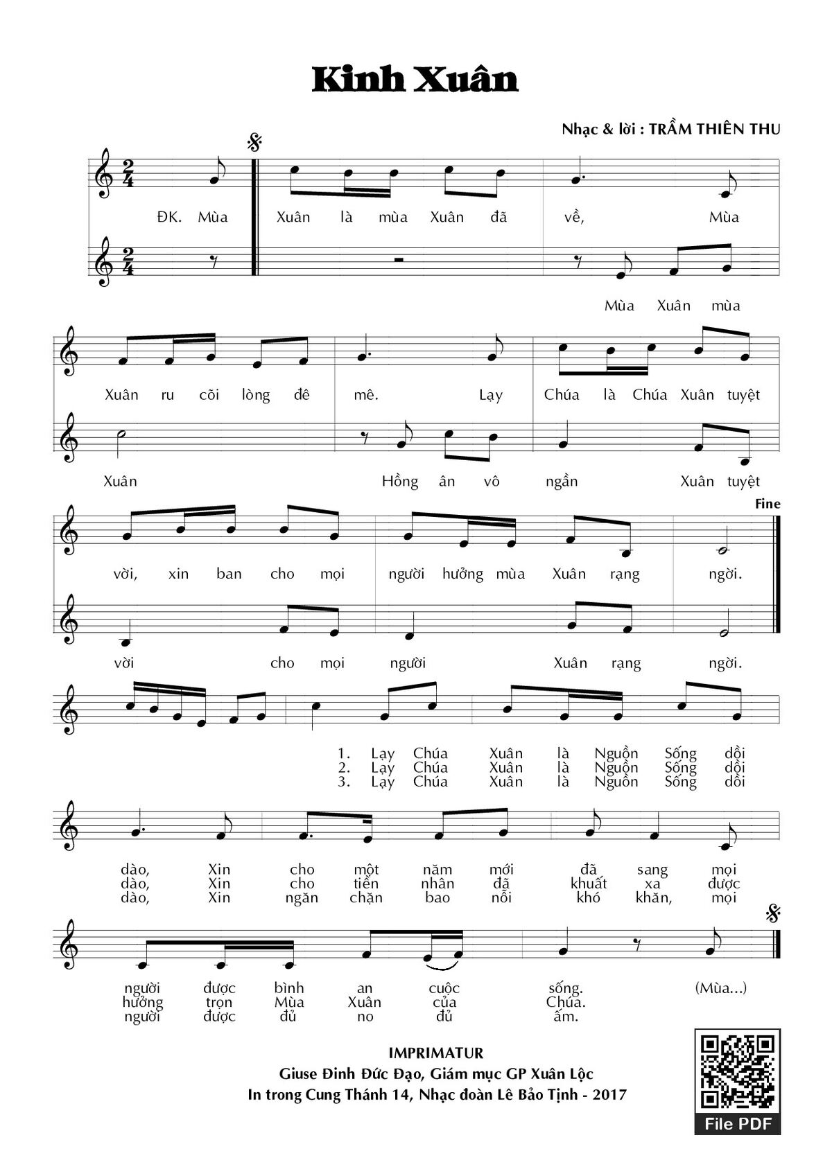 Sheet nhạc có nốt Kinh xuân của nhạc sĩ Trầm Thiên Thu và file PDF nốt nhạc đăng lên đây nhằm giúp các bạn xướng âm cho đúng nốt và hát thêm hay, chỉ mang tính chất tham khảo, không có mục đích thương mại. Bản quyền thuộc về tác giả và tổ chức nắm bản quyền, Truongca.com không giữ bất kỳ bản quyền của nội dung nào cả. Các bạn có thể tải về bản PDF chất lượng cao, gồm khuông nhạc có nốt với đường link file PDF bên trên.