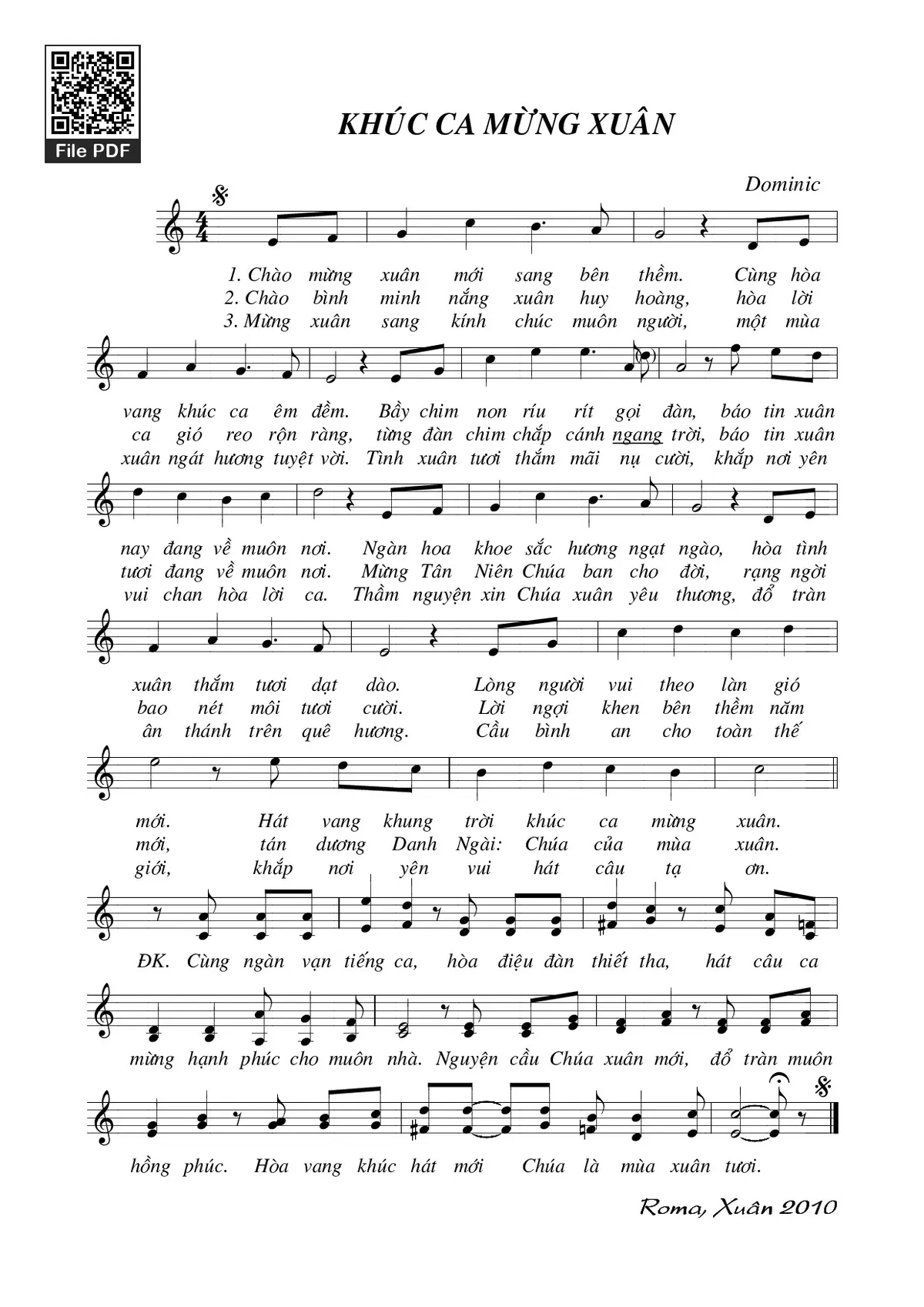 Sheet nhạc có nốt Khúc ca mừng xuân của nhạc sĩ Dominic và file PDF nốt nhạc đăng lên đây nhằm giúp các bạn xướng âm cho đúng nốt và hát thêm hay, chỉ mang tính chất tham khảo, không có mục đích thương mại. Bản quyền thuộc về tác giả và tổ chức nắm bản quyền, Truongca.com không giữ bất kỳ bản quyền của nội dung nào cả. Các bạn có thể tải về bản PDF chất lượng cao, gồm khuông nhạc có nốt với đường link file PDF bên trên.