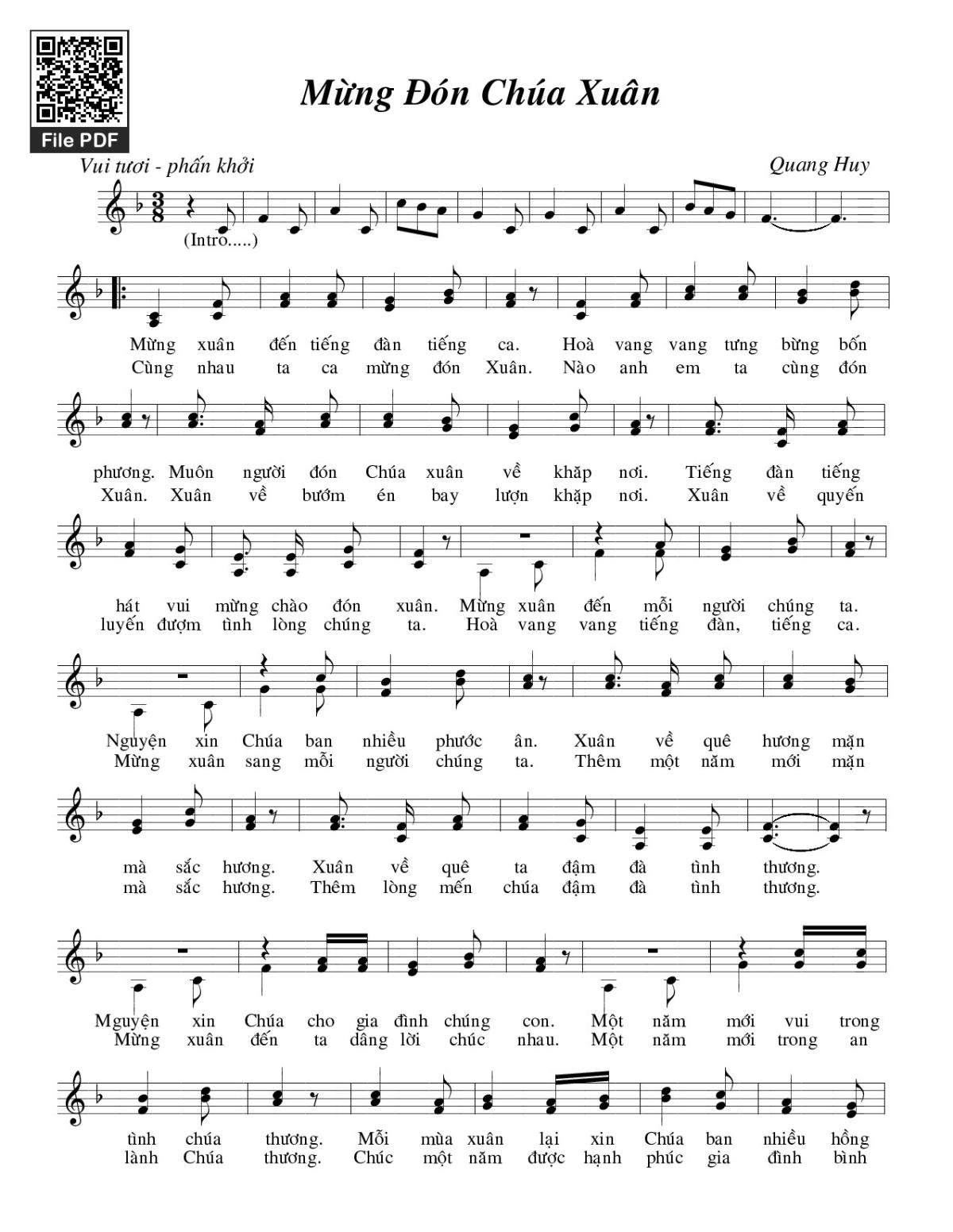 Sheet nhạc có nốt Mừng đón Chúa Xuân của nhạc sĩ Quang Huy và file PDF nốt nhạc đăng lên đây nhằm giúp các bạn xướng âm cho đúng nốt và hát thêm hay, chỉ mang tính chất tham khảo, không có mục đích thương mại. Bản quyền thuộc về tác giả và tổ chức nắm bản quyền, Truongca.com không giữ bất kỳ bản quyền của nội dung nào cả. Các bạn có thể tải về bản PDF chất lượng cao, gồm khuông nhạc có nốt với đường link file PDF bên trên.