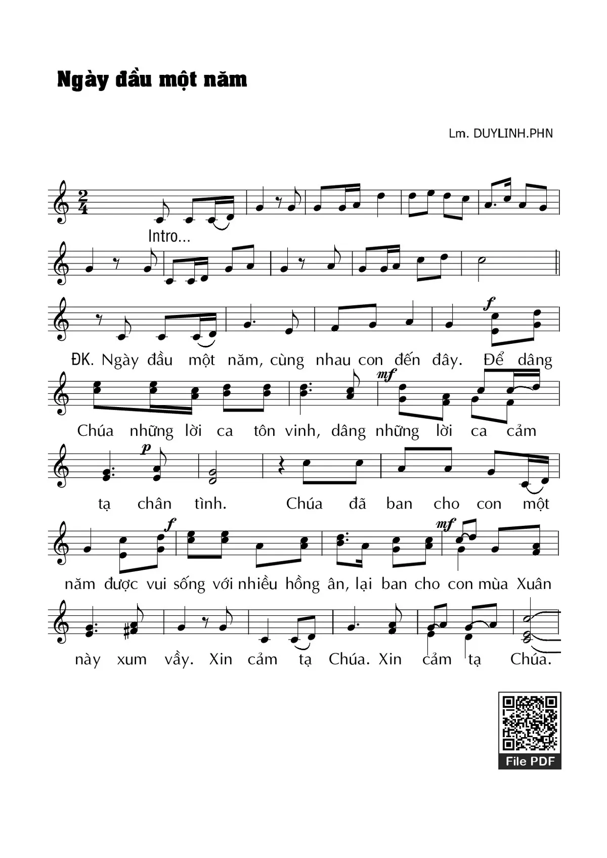 Sheet nhạc có nốt Ngày đầu một năm của nhạc sĩ Duy Linh PHN và file PDF nốt nhạc đăng lên đây nhằm giúp các bạn xướng âm cho đúng nốt và hát thêm hay, chỉ mang tính chất tham khảo, không có mục đích thương mại. Bản quyền thuộc về tác giả và tổ chức nắm bản quyền, Truongca.com không giữ bất kỳ bản quyền của nội dung nào cả. Các bạn có thể tải về bản PDF chất lượng cao, gồm khuông nhạc có nốt với đường link file PDF bên trên.