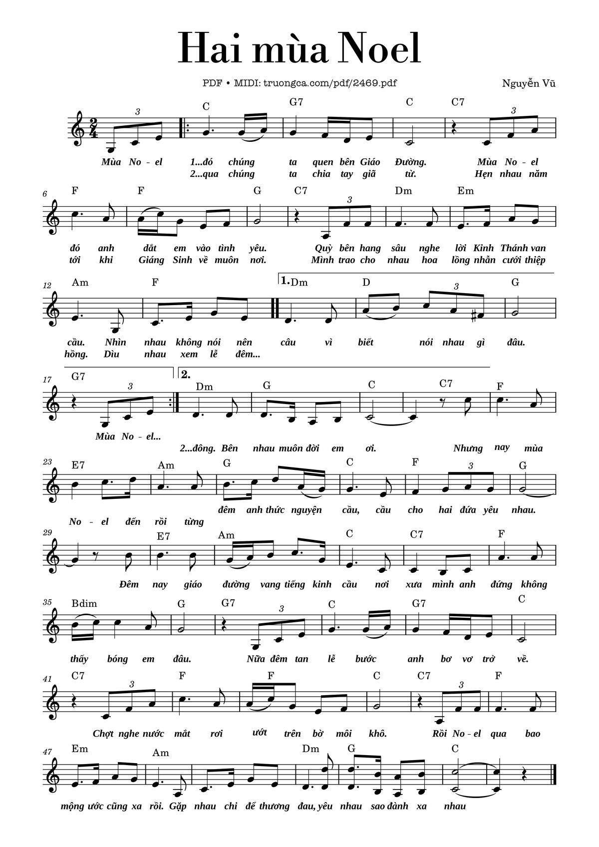 Chọn nút dấu + để tăng tông lên nửa cung, nút dấu - để giảm tông xuống nửa cung. Rê chuột vào hợp âm để xem các thế bấm hợp âm của bài hát Hai mùa Noel.