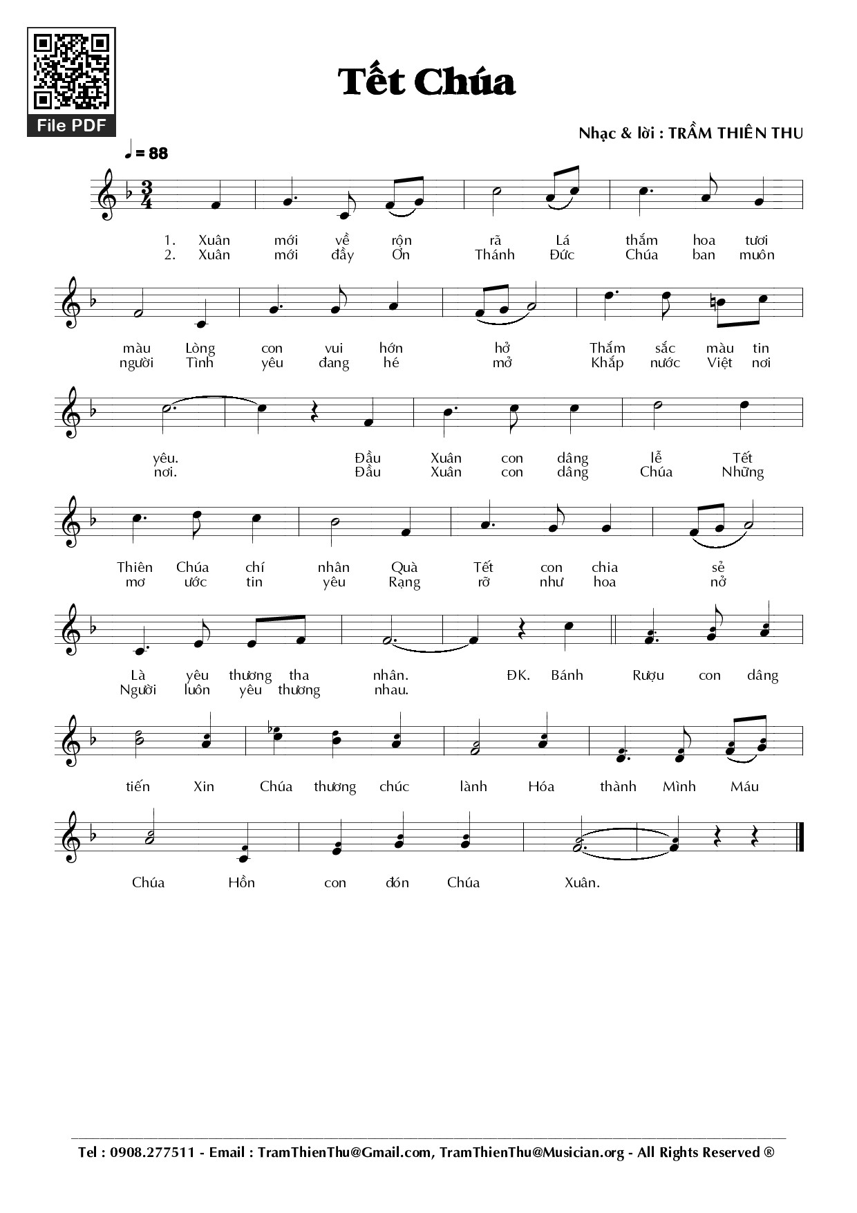 Sheet nhạc có nốt Tết Chúa của nhạc sĩ Trầm Thiên Thu và file PDF nốt nhạc đăng lên đây nhằm giúp các bạn xướng âm cho đúng nốt và hát thêm hay, chỉ mang tính chất tham khảo, không có mục đích thương mại. Bản quyền thuộc về tác giả và tổ chức nắm bản quyền, Truongca.com không giữ bất kỳ bản quyền của nội dung nào cả. Các bạn có thể tải về bản PDF chất lượng cao, gồm khuông nhạc có nốt với đường link file PDF bên trên.