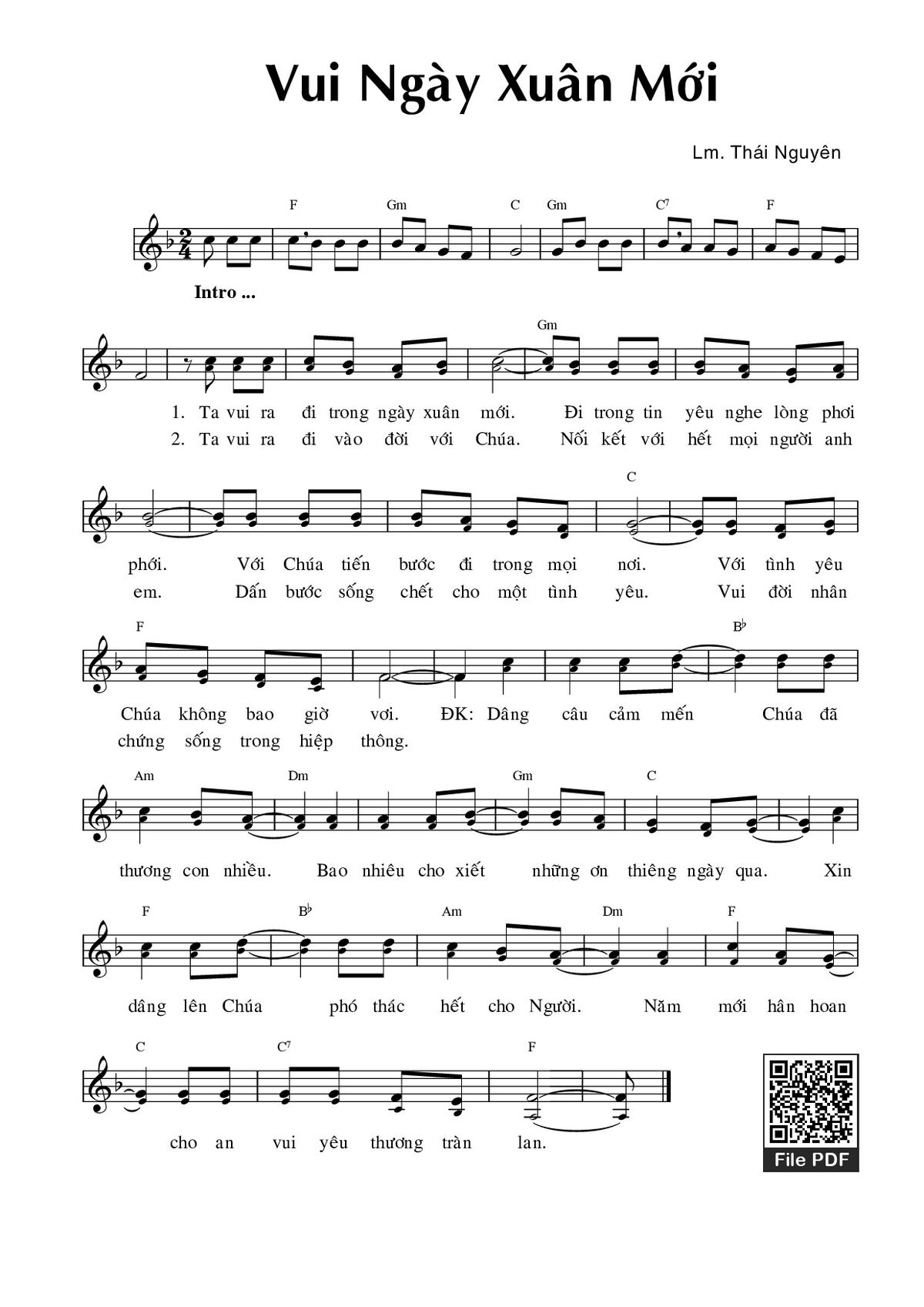 Sheet nhạc có nốt Vui ngày xuân mới của nhạc sĩ Thái Nguyên và file PDF nốt nhạc đăng lên đây nhằm giúp các bạn xướng âm cho đúng nốt và hát thêm hay, chỉ mang tính chất tham khảo, không có mục đích thương mại. Bản quyền thuộc về tác giả và tổ chức nắm bản quyền, Truongca.com không giữ bất kỳ bản quyền của nội dung nào cả. Các bạn có thể tải về bản PDF chất lượng cao, gồm khuông nhạc có nốt với đường link file PDF bên trên.