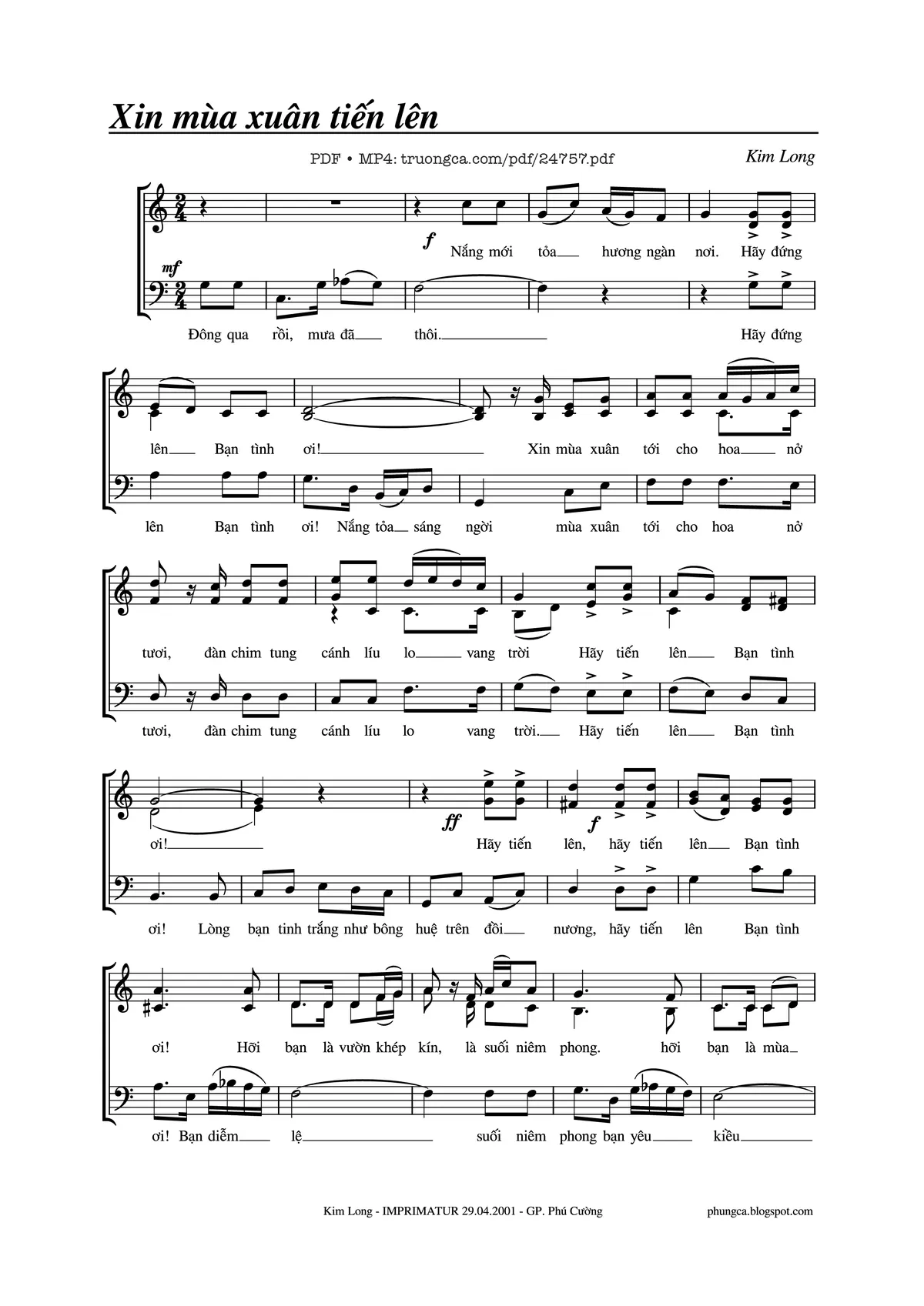 Kim Long Nắng mới tỏa hương ngàn nơi, hãy đứng lên bạn tình ơi [PDF] [Sheet] [Lời H.A] [Mp4/Midi]