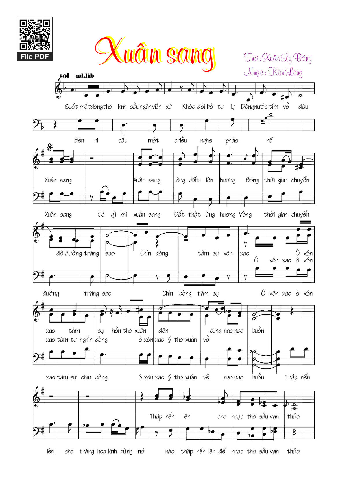 Sheet nhạc có nốt Xuân sang của nhạc sĩ Kim Long và file PDF nốt nhạc đăng lên đây nhằm giúp các bạn xướng âm cho đúng nốt và hát thêm hay, chỉ mang tính chất tham khảo, không có mục đích thương mại. Bản quyền thuộc về tác giả và tổ chức nắm bản quyền, Truongca.com không giữ bất kỳ bản quyền của nội dung nào cả. Các bạn có thể tải về bản PDF chất lượng cao, gồm khuông nhạc có nốt với đường link file PDF bên trên.