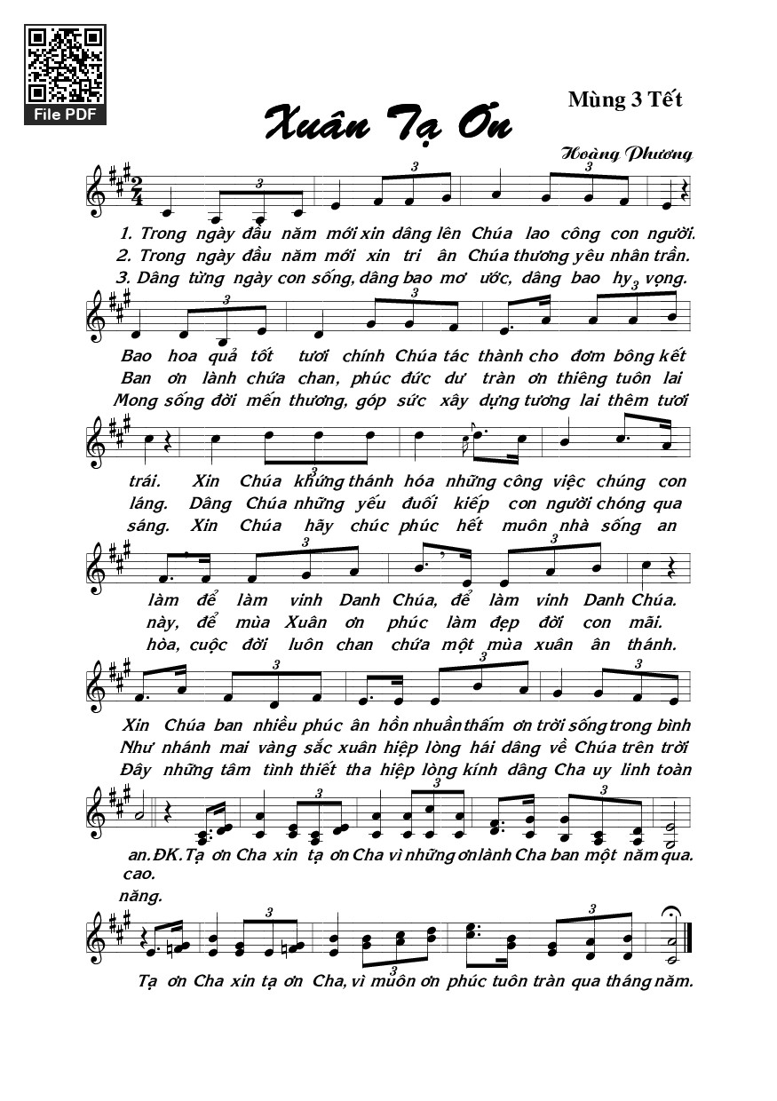 Sheet nhạc có nốt Xuân tạ ơn của nhạc sĩ Hoàng Phương và file PDF nốt nhạc đăng lên đây nhằm giúp các bạn xướng âm cho đúng nốt và hát thêm hay, chỉ mang tính chất tham khảo, không có mục đích thương mại. Bản quyền thuộc về tác giả và tổ chức nắm bản quyền, Truongca.com không giữ bất kỳ bản quyền của nội dung nào cả. Các bạn có thể tải về bản PDF chất lượng cao, gồm khuông nhạc có nốt với đường link file PDF bên trên.