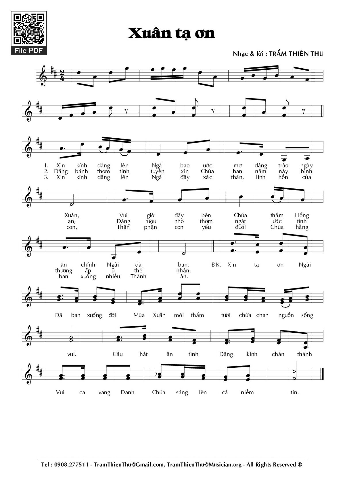 Sheet nhạc có nốt Xuân tạ ơn của nhạc sĩ Trầm Thiên Thu và file PDF nốt nhạc đăng lên đây nhằm giúp các bạn xướng âm cho đúng nốt và hát thêm hay, chỉ mang tính chất tham khảo, không có mục đích thương mại. Bản quyền thuộc về tác giả và tổ chức nắm bản quyền, Truongca.com không giữ bất kỳ bản quyền của nội dung nào cả. Các bạn có thể tải về bản PDF chất lượng cao, gồm khuông nhạc có nốt với đường link file PDF bên trên.