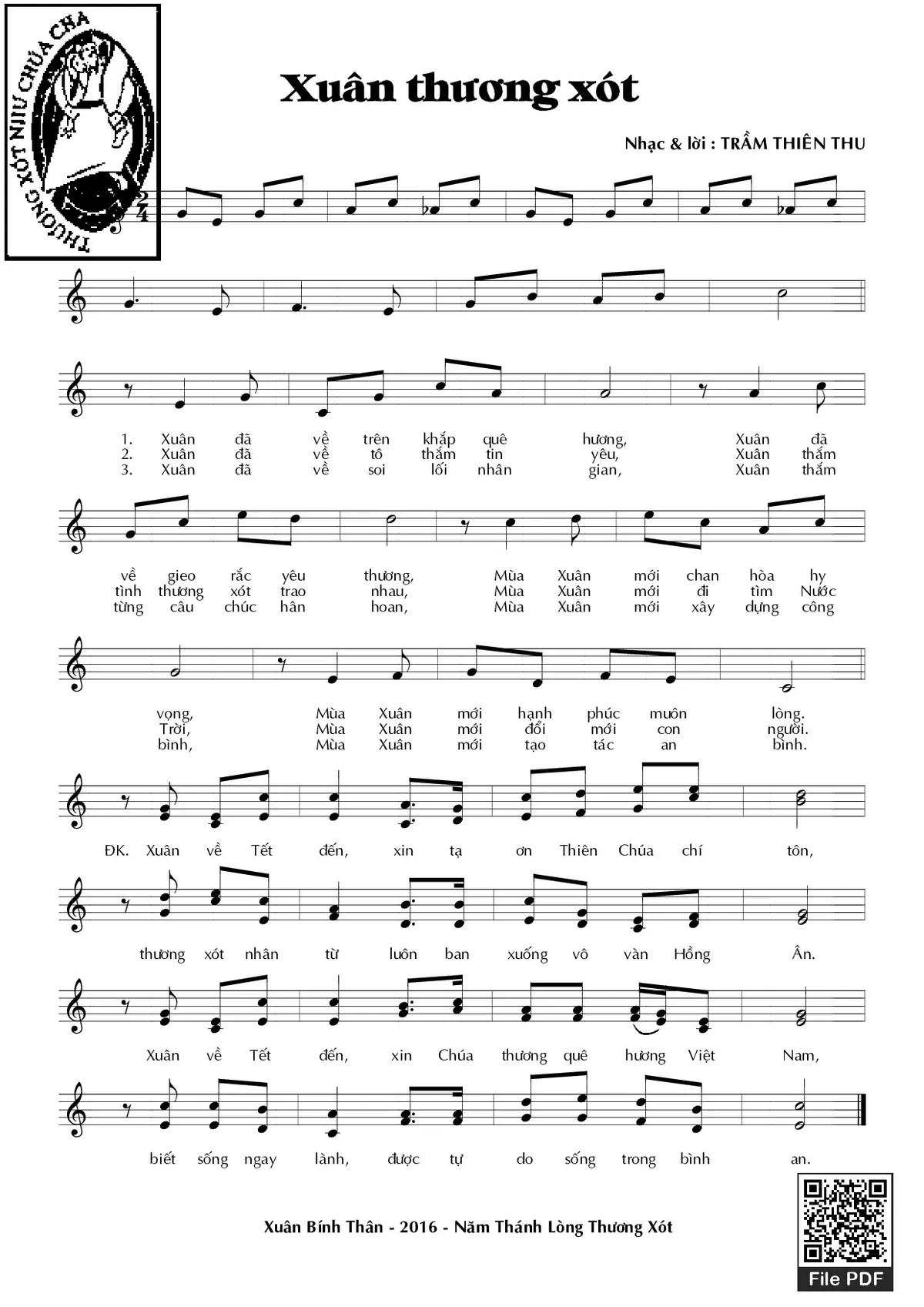 Sheet nhạc có nốt Xuân thương xót của nhạc sĩ Trầm Thiên Thu và file PDF nốt nhạc đăng lên đây nhằm giúp các bạn xướng âm cho đúng nốt và hát thêm hay, chỉ mang tính chất tham khảo, không có mục đích thương mại. Bản quyền thuộc về tác giả và tổ chức nắm bản quyền, Truongca.com không giữ bất kỳ bản quyền của nội dung nào cả. Các bạn có thể tải về bản PDF chất lượng cao, gồm khuông nhạc có nốt với đường link file PDF bên trên.