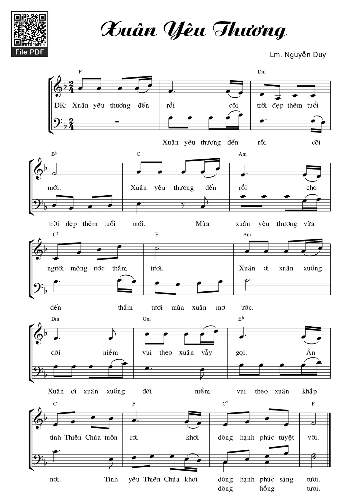Sheet nhạc có nốt Xuân yêu thương của nhạc sĩ Nguyễn Duy và file PDF nốt nhạc đăng lên đây nhằm giúp các bạn xướng âm cho đúng nốt và hát thêm hay, chỉ mang tính chất tham khảo, không có mục đích thương mại. Bản quyền thuộc về tác giả và tổ chức nắm bản quyền, Truongca.com không giữ bất kỳ bản quyền của nội dung nào cả. Các bạn có thể tải về bản PDF chất lượng cao, gồm khuông nhạc có nốt với đường link file PDF bên trên.