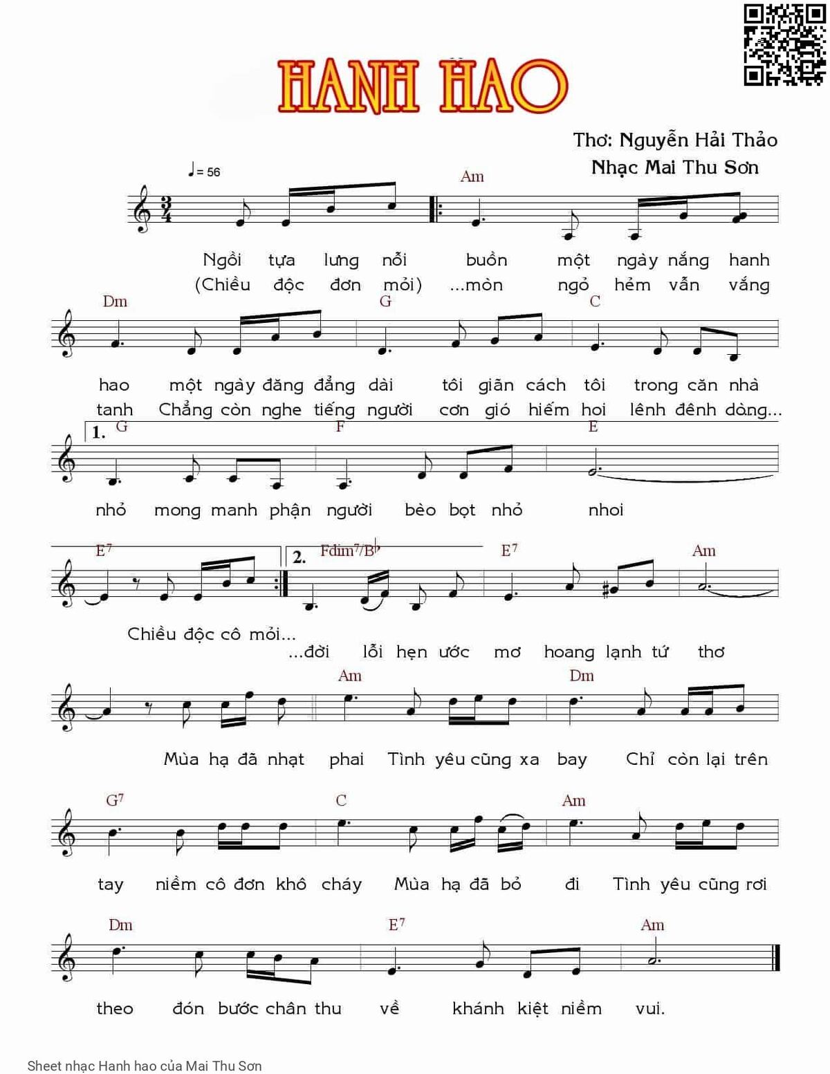 Mai Thu Sơn Ngồi tựa lưng nỗi buồn một ngày nắng hanh hao [PDF] [Sheet] [Lời H.A] [Mp4/Midi]