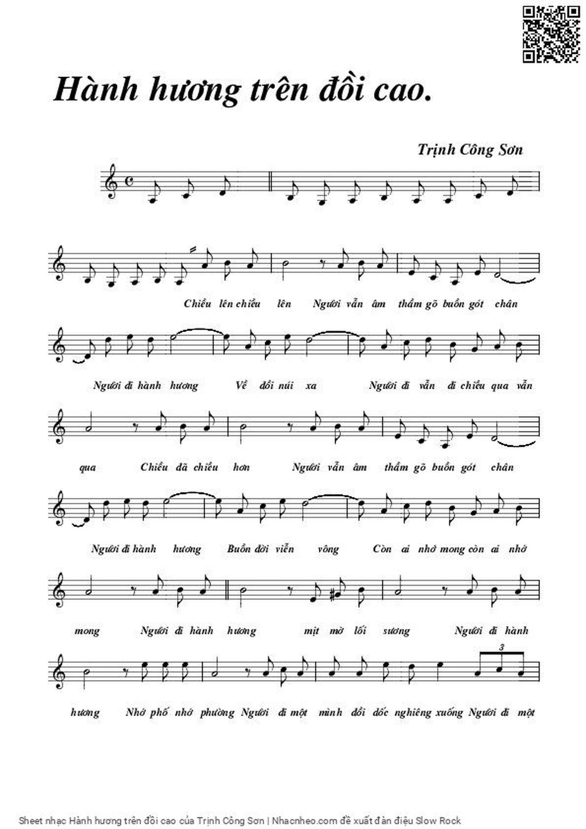 Phần nghe hát Hành hương trên đồi cao (Trịnh Công Sơn) được nhúng từ Youtube, Musescore hoặc link ngoài và chịu sự kiểm soát bản quyền của bên thứ ba đó, vì vậy có thể bị xóa hoặc chèn quảng cáo bất kỳ lúc nào. Nếu bạn không nghe - xem được ca sĩ hát tức là đã bị Youtube hoặc Musescore kiểm soát.