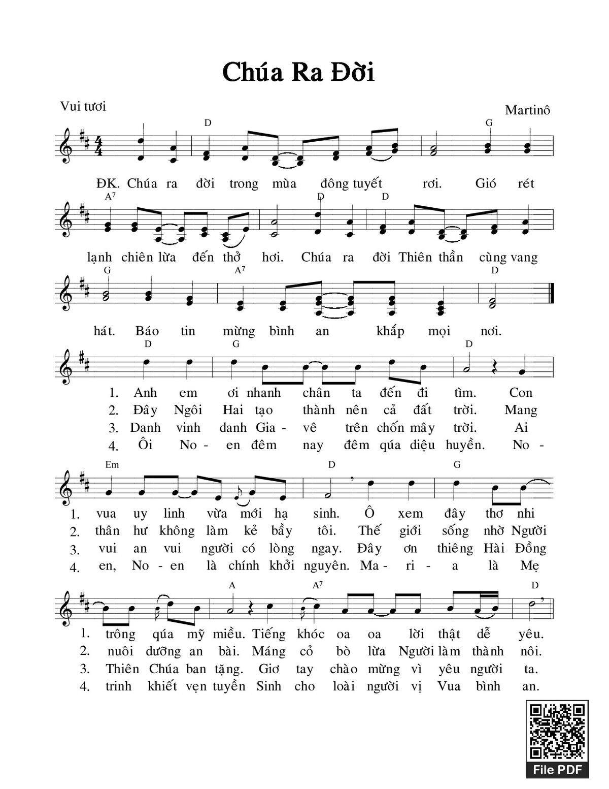 Điệp khúc: Chúa ra đời trong mùa đông tuyết rơi. Gió rét lạnh chiên lừa đến thở hơi. Chúa ra đời Thiên Thần cùng vang hát. Báo tin mừng bình an khắp mọi nơi.
