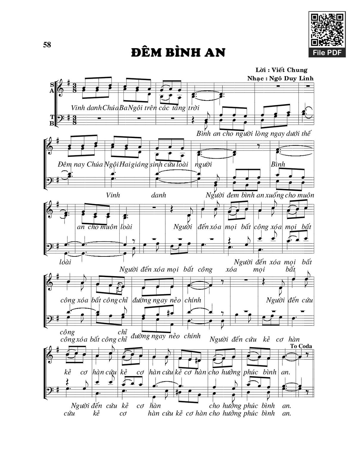 Điệp khúc. Vinh danh Chúa Ba Ngôi trên các tầng trời. Bình an cho người lòng ngay dưới thế. Đêm nay Chúa Ngôi Hai giáng sinh cứu loài người. Người đem bình an xuống cho muôn người. Người đến xóa mọi bất công, xóa mọi bất công, xóa bất công chỉ đường ngay nẻo chính. Người đến cứu kẻ cơ hàn, cứu kẻ cơ hàn, cứu kể cơ hàn cho hưởng phúc bình an.