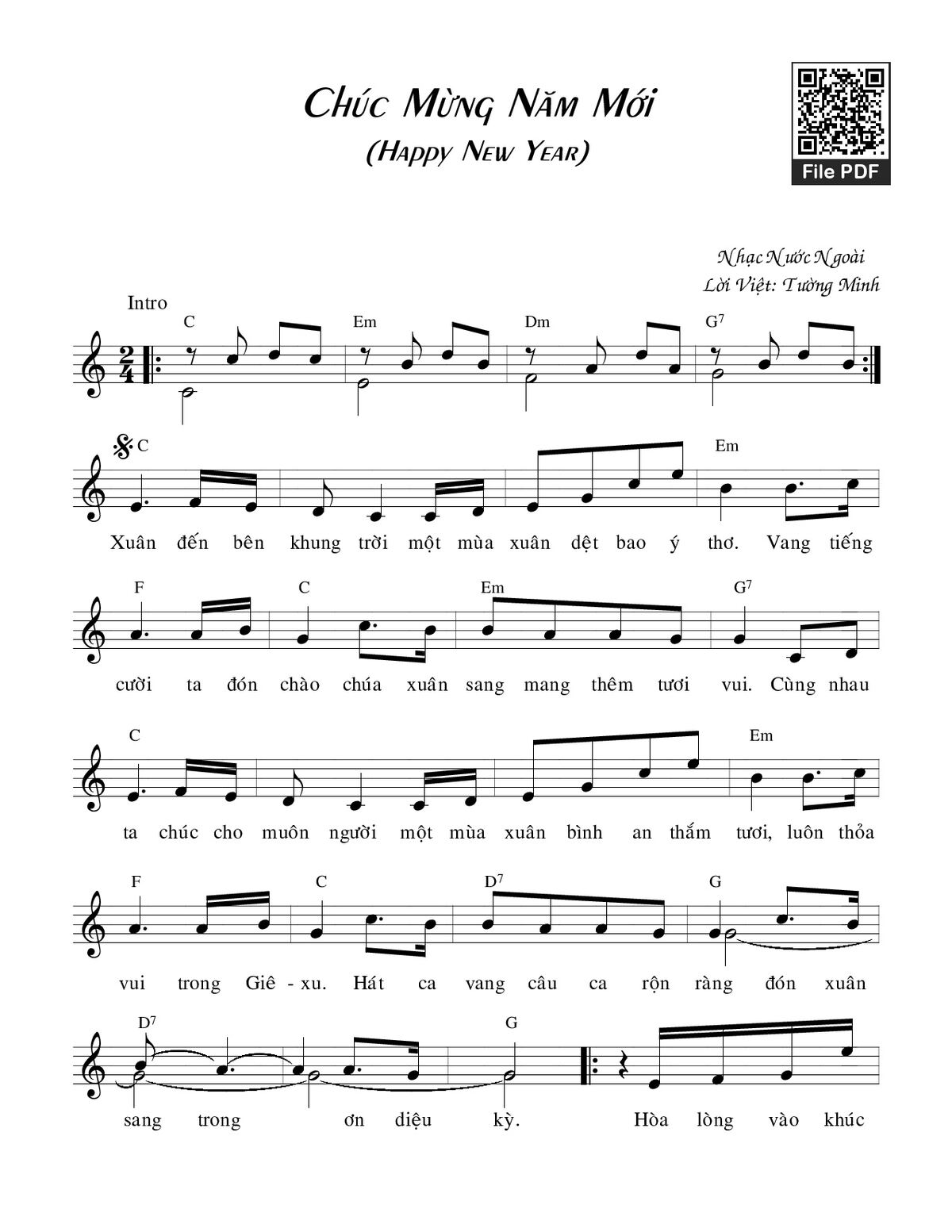 Sheet nhạc có nốt Happy New Year - Thánh Ca của nhạc sĩ Tường Minh và file PDF nốt nhạc đăng lên đây nhằm giúp các bạn xướng âm cho đúng nốt và hát thêm hay, chỉ mang tính chất tham khảo, không có mục đích thương mại. Bản quyền thuộc về tác giả và tổ chức nắm bản quyền, Truongca.com không giữ bất kỳ bản quyền của nội dung nào cả. Các bạn có thể tải về bản PDF chất lượng cao, gồm khuông nhạc có nốt với đường link file PDF bên trên.