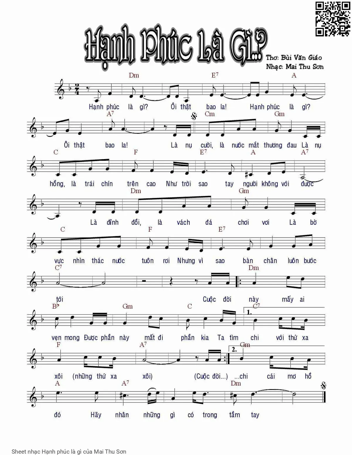 Mai Thu Sơn Hạnh phúc là gì ôi thật bao la Hạnh phúc là gì ôi thật bao la [PDF] [Sheet] [Lời H.A] [Mp4/Midi]
