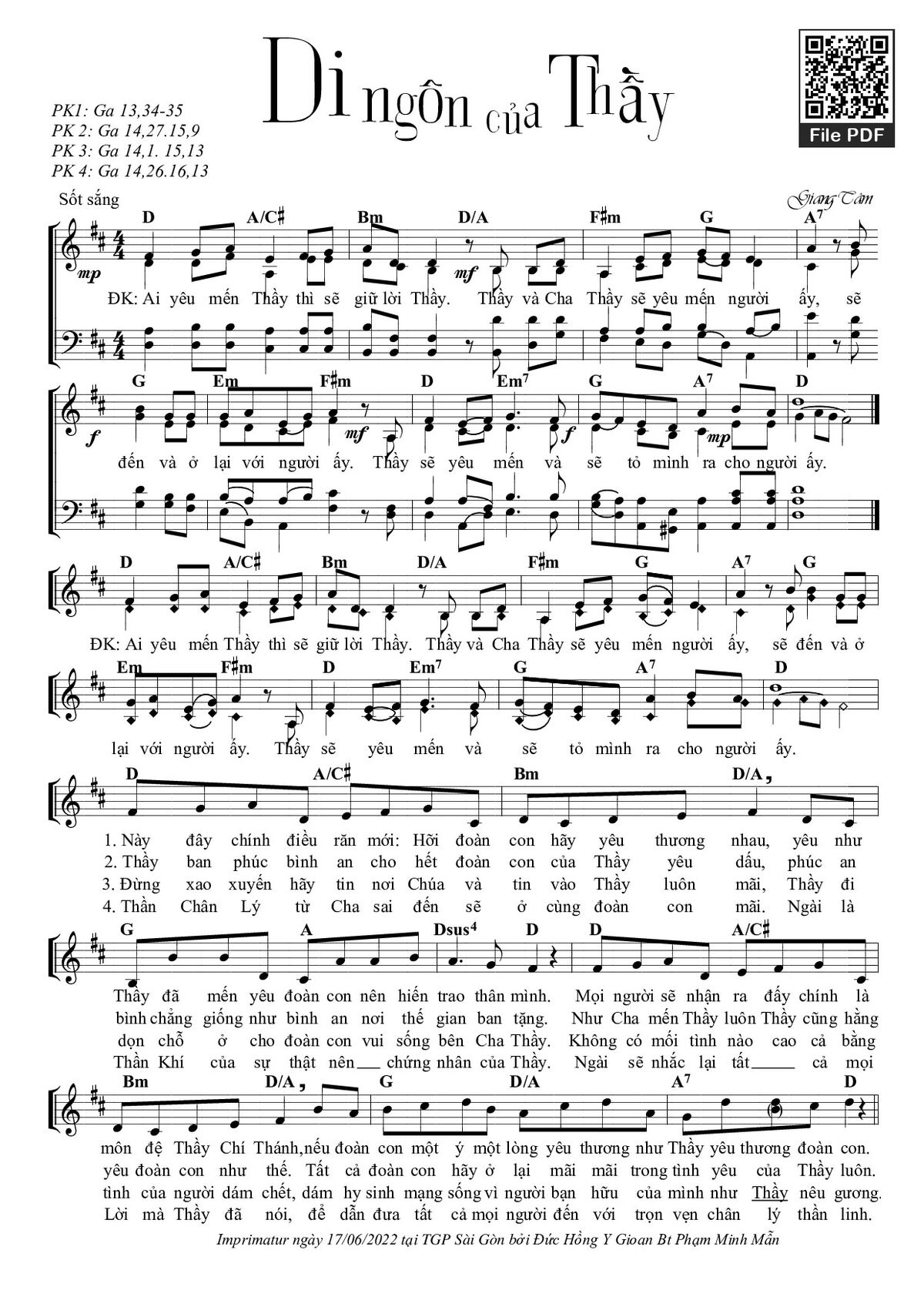 Điệp khúc: Ai yêu mến Thầy thì sẽ giữ lời Thầy. Thầy và Cha Thầy sẽ yêu mến người ấy, sẽ đến và ở lại với người ấy. Thầy sẽ yêu mến và sẽ tỏ mình ra cho người ấy.