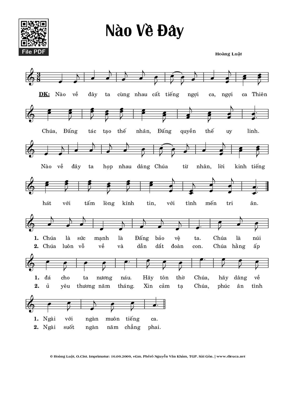 Điệp khúc: Nào về đây ta cùng nhau cất tiếng ngợi ca, ngợi ca Thiên Chúa, Đấng tác tạo thế nhân, Đấng quyền thế uy linh. Nào về đây ta họp nhau dâng Chúa từ nhân, lời kinh tiếng hát với tấm lòng kính tin, với tình mến tri ân.