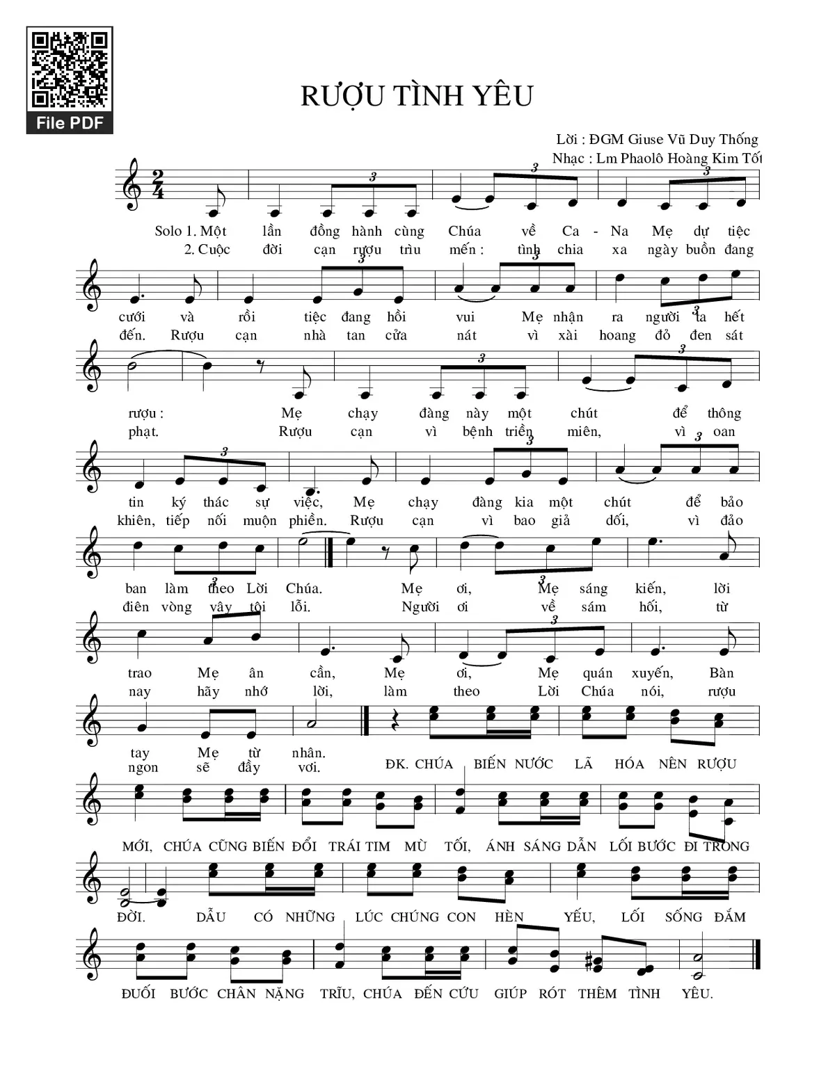 Điệp khúc: Chúa biến nước lã hóa nên rượu mới. Chúa cũng biến đổi trái tim mù tối, ánh sáng dẫn lối bước đi trong đời. Dẫu có những lúc chúng con hèn yếu, lối sống đắm đuối bước chân nặng trĩu, Chúa đến cứu giúp rót thêm tình yêu.