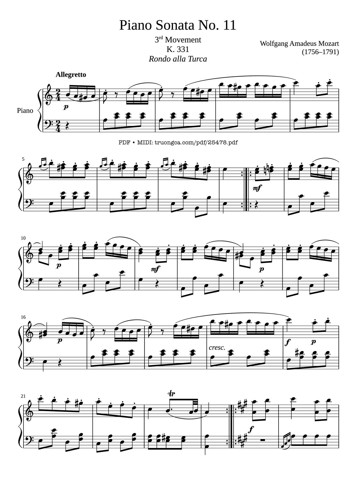Phần nghe hát Sonata No. 11 (Wolfgang Amadeus Mozart (1756–1791) được nhúng từ Youtube, Musescore hoặc link ngoài và chịu sự kiểm soát bản quyền của bên thứ ba đó, vì vậy có thể bị xóa hoặc chèn quảng cáo bất kỳ lúc nào. Nếu bạn không nghe - xem được ca sĩ hát tức là đã bị Youtube hoặc Musescore kiểm soát.