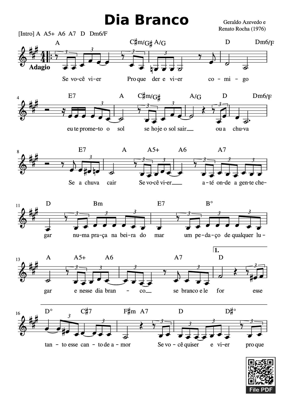 Phần nghe hát Dia Branco (Geraldo Azevedo e) được nhúng từ Youtube, Musescore hoặc link ngoài và chịu sự kiểm soát bản quyền của bên thứ ba đó, vì vậy có thể bị xóa hoặc chèn quảng cáo bất kỳ lúc nào. Nếu bạn không nghe - xem được ca sĩ hát tức là đã bị Youtube hoặc Musescore kiểm soát.