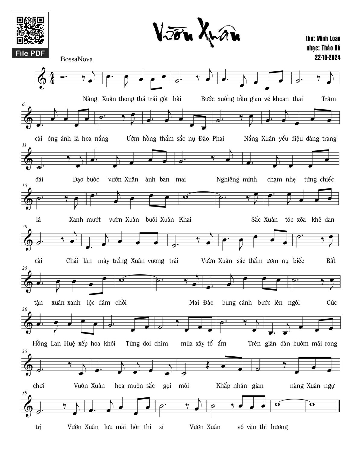Phần nghe hát Vườn xuân (Thảo Hồ) được nhúng từ Youtube, Musescore hoặc link ngoài và chịu sự kiểm soát bản quyền của bên thứ ba đó, vì vậy có thể bị xóa hoặc chèn quảng cáo bất kỳ lúc nào. Nếu bạn không nghe - xem được ca sĩ hát tức là đã bị Youtube hoặc Musescore kiểm soát.