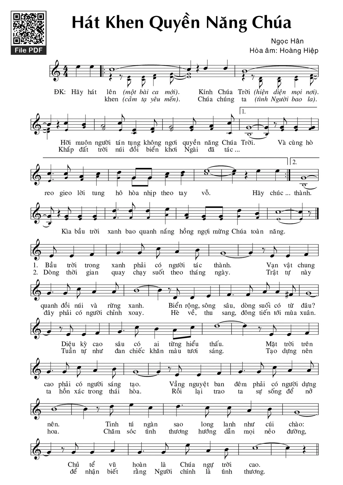 Điệp khúc. Hãy hát lên kính Chúa Trời . Hỡi muôn người tán tụng không ngơi quyền năng Chúa Trời. Và cùng hò reo gieo lời tung hô hòa nhịp theo tay vỗ. Hãy chúc khen Chúa chúng ta . Khắp đất trời núi đồi biển khơi Ngài đã tác thành. Kìa bầu trời xanh bao quanh nắng hồng, ngợi mừng Chúa toàn năng.