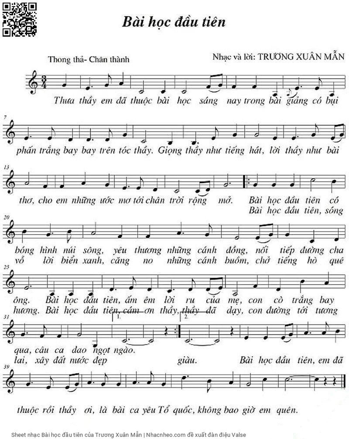 Phần nghe hát Bài học đầu tiên (Trương Xuân Mẫn) được nhúng từ Youtube, Musescore hoặc link ngoài và chịu sự kiểm soát bản quyền của bên thứ ba đó, vì vậy có thể bị xóa hoặc chèn quảng cáo bất kỳ lúc nào. Nếu bạn không nghe - xem được ca sĩ hát tức là đã bị Youtube hoặc Musescore kiểm soát.