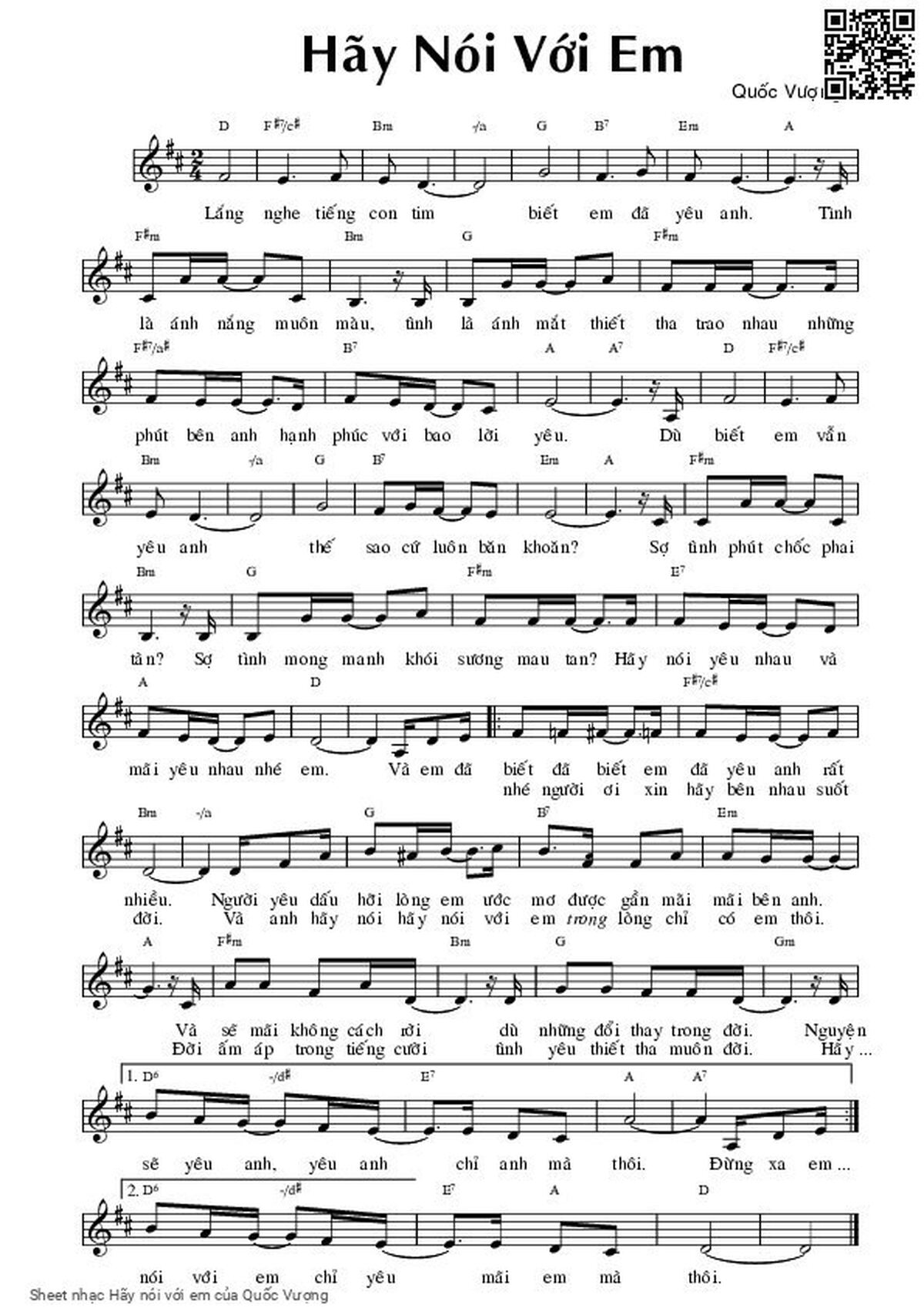 Phần nghe hát Hãy nói với em (Quốc Vượng) được nhúng từ Youtube, Musescore hoặc link ngoài và chịu sự kiểm soát bản quyền của bên thứ ba đó, vì vậy có thể bị xóa hoặc chèn quảng cáo bất kỳ lúc nào. Nếu bạn không nghe - xem được ca sĩ hát tức là đã bị Youtube hoặc Musescore kiểm soát.