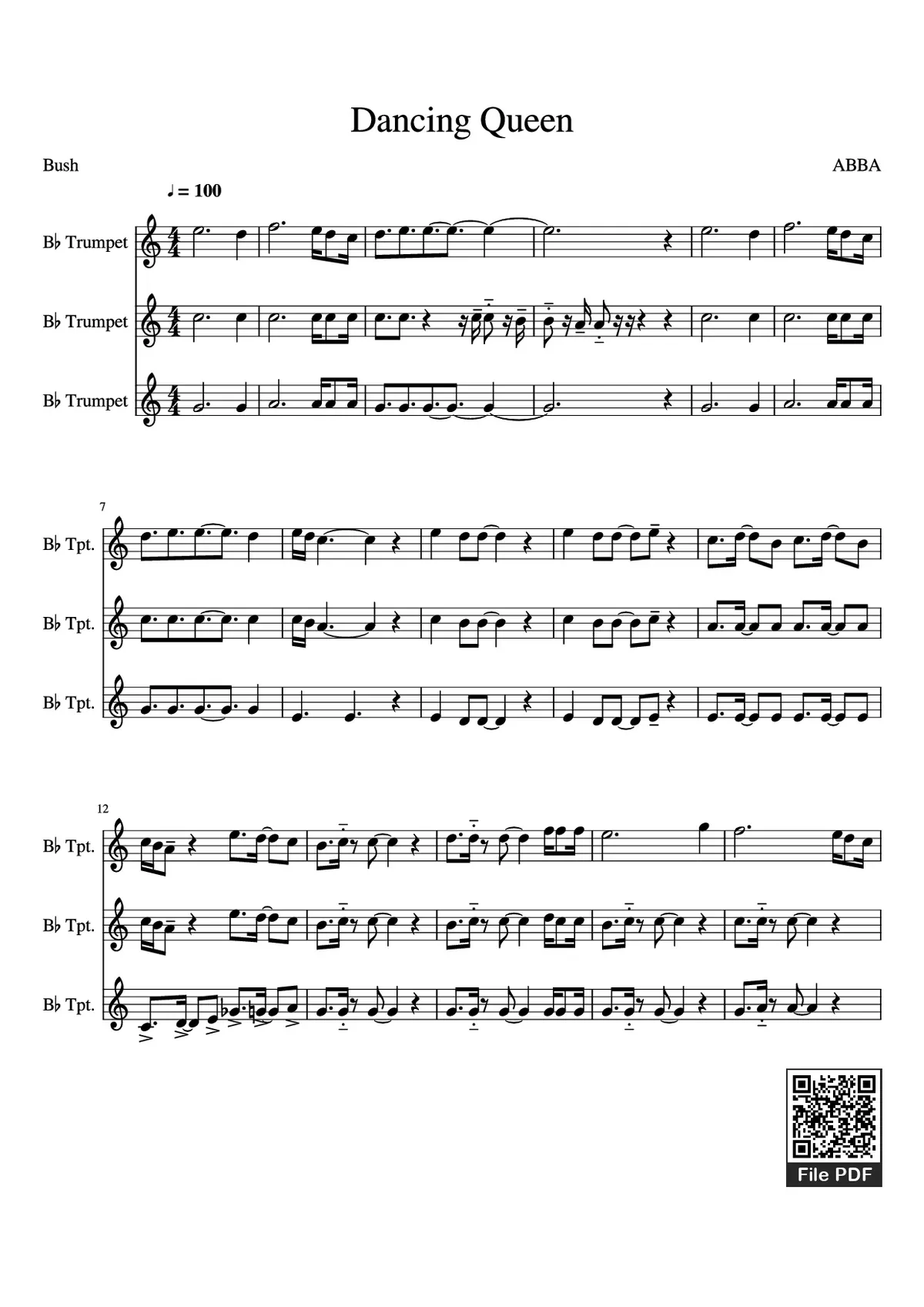 Download and print in PDF or MIDI free sheet music of dancing queen - ABBA for Dancing Queen by ABBA arranged by Sebastian River Brass Choir for Trumpet in b-flat (Mixed Trio)