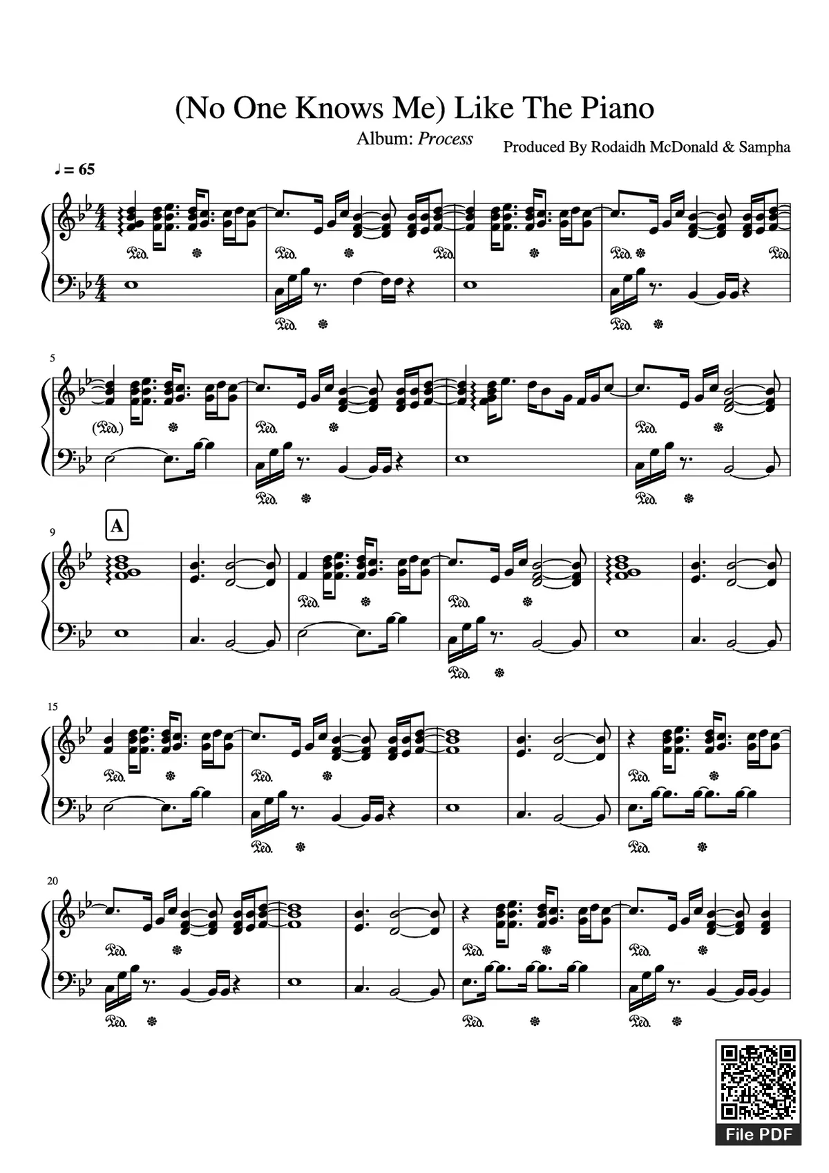 Phần đàn mẫu (No One Knows Me) Like The Piano (Produced By Rodaidh McDonald & Sampha) được nhúng từ Youtube, Musescore hoặc link ngoài và chịu sự kiểm soát bản quyền của bên thứ ba đó, vì vậy có thể bị xóa hoặc chèn quảng cáo bất kỳ lúc nào. Nếu bạn không nghe - xem được phần đàn mẫu hát mẫu tức là đã bị Youtube/Musescore kiểm soát.
