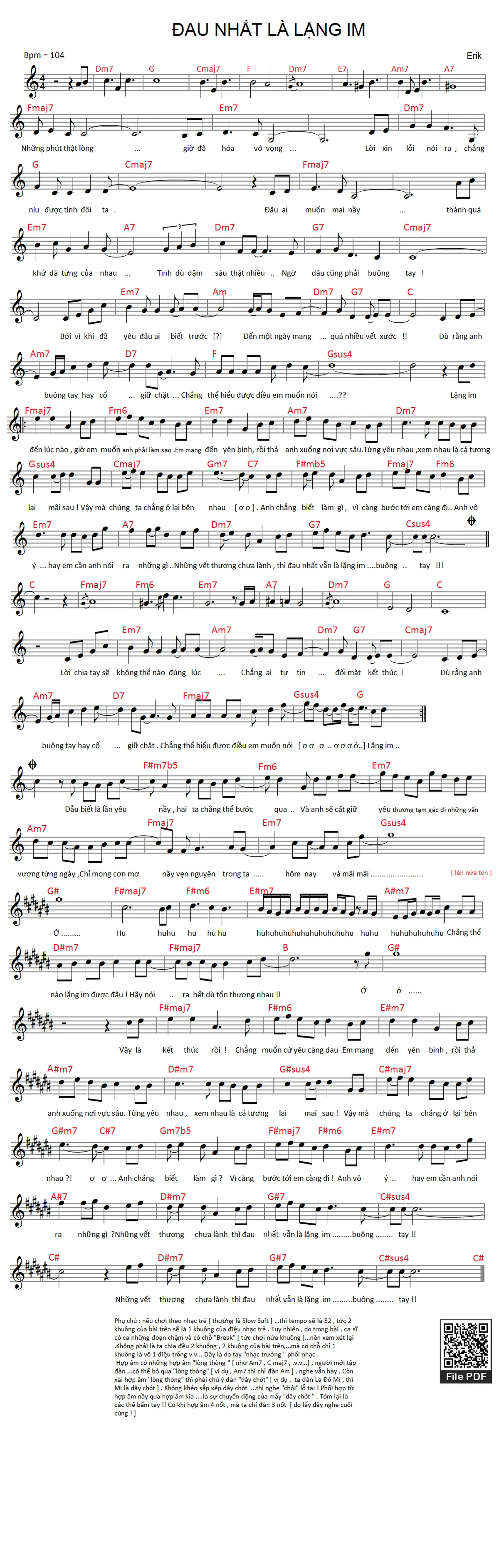 Chọn nút dấu + để tăng tông lên nửa cung, nút dấu - để giảm tông xuống nửa cung. Rê chuột vào hợp âm để xem các thế bấm hợp âm của bài hát Đau nhất là lặng im.