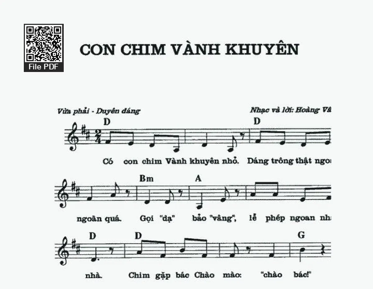 Sheet nhạc có nốt Con Chim Vành Khuyên của nhạc sĩ Hoàng Vân và file PDF nốt nhạc đăng lên đây nhằm giúp các bạn xướng âm cho đúng nốt và hát thêm hay, chỉ mang tính chất tham khảo, không có mục đích thương mại. Bản quyền thuộc về tác giả và tổ chức nắm bản quyền, Truongca.com không giữ bất kỳ bản quyền của nội dung nào cả. Các bạn có thể tải về bản PDF chất lượng cao, gồm khuông nhạc có nốt với đường link file PDF bên trên.