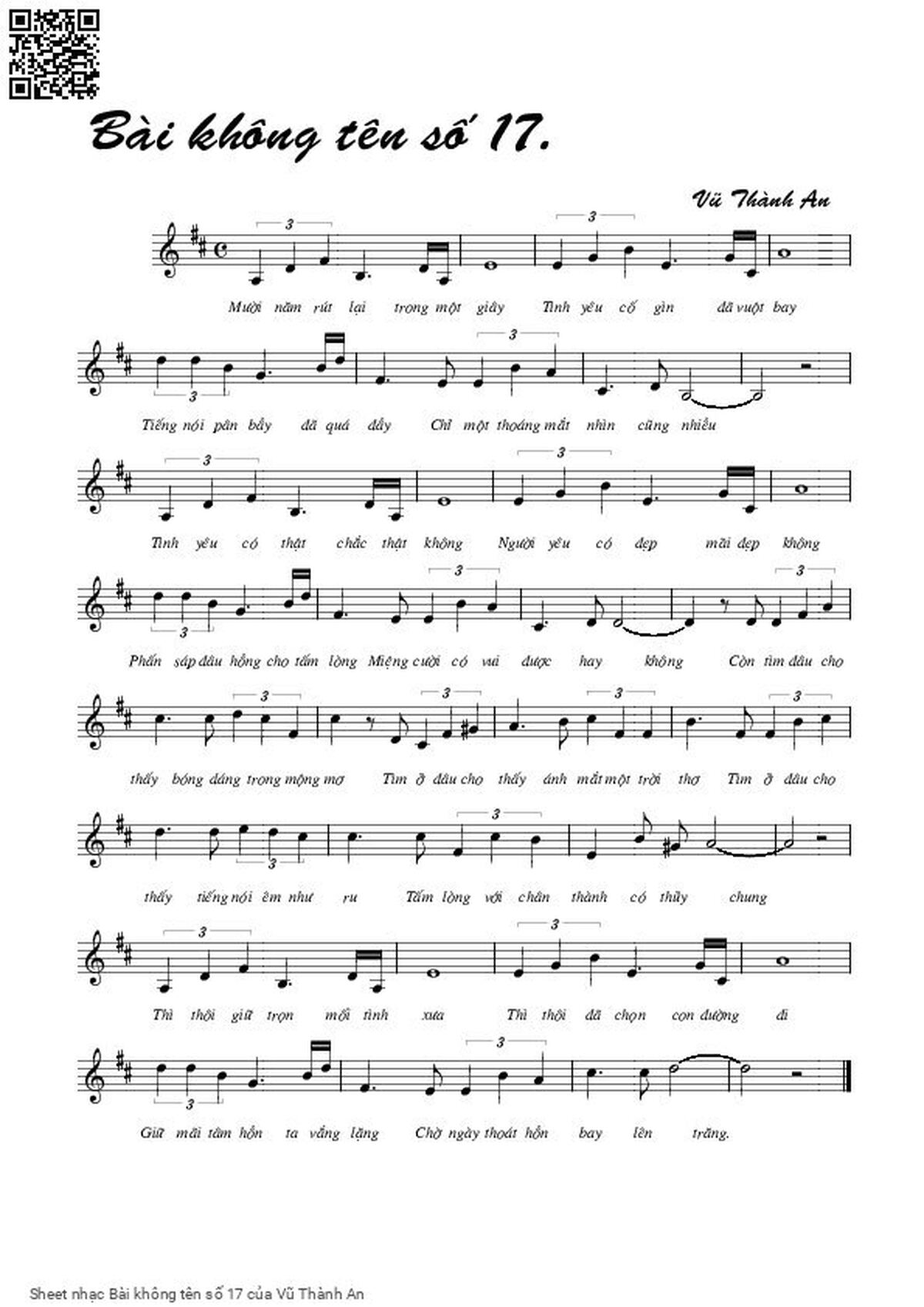 Phần nghe hát Bài không tên số 17 (Vũ Thành An) được nhúng từ Youtube, Musescore hoặc link ngoài và chịu sự kiểm soát bản quyền của bên thứ ba đó, vì vậy có thể bị xóa hoặc chèn quảng cáo bất kỳ lúc nào. Nếu bạn không nghe - xem được ca sĩ hát tức là đã bị Youtube hoặc Musescore kiểm soát.