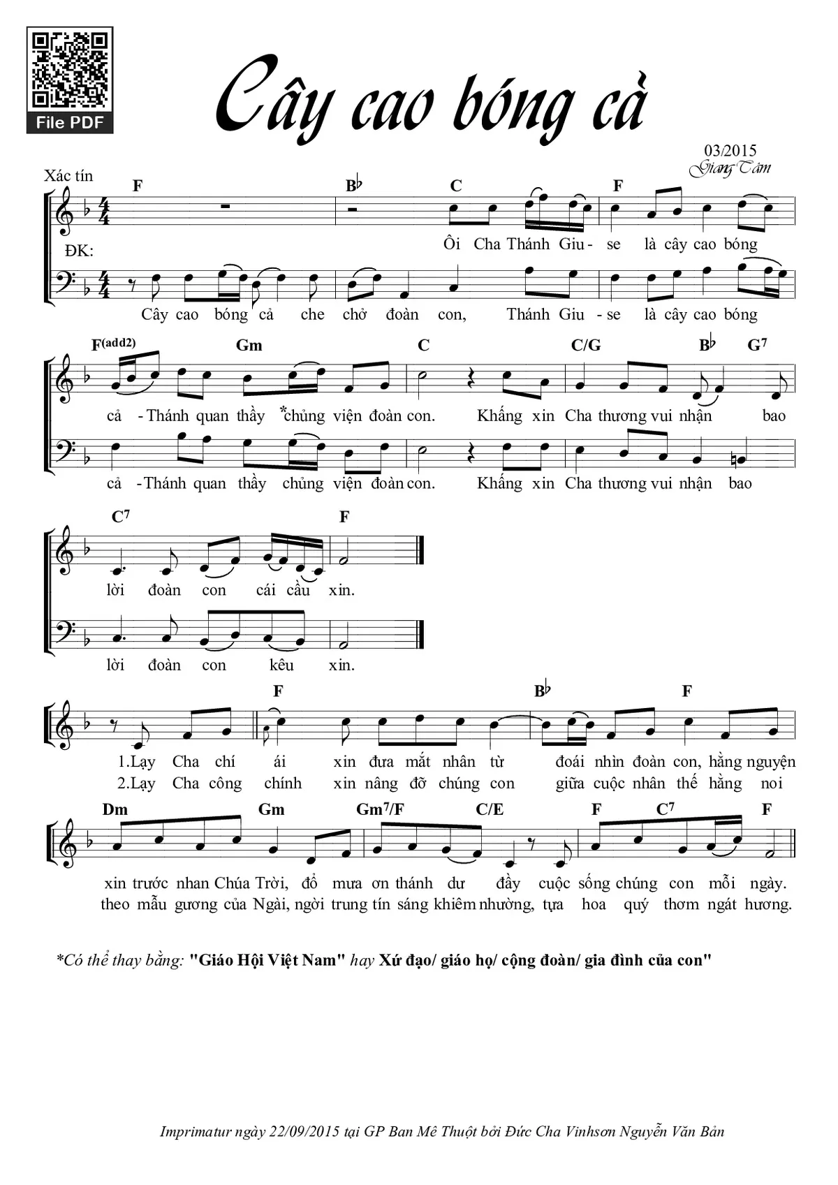 Điệp khúc: (Cây cao bóng cả che chở đoàn con) Ôi Cha Thánh Giu-se là cây cao bóng cả Thánh quan thầy *chủng viện đoàn con. Khấng xin Cha thương vui nhận bao lời đoàn con cái cầu xin.