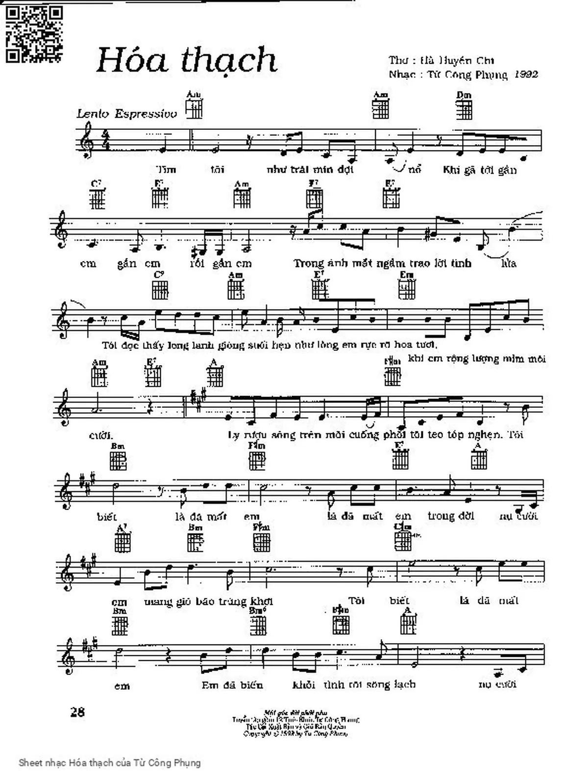 Chọn nút dấu + để tăng tông lên nửa cung, nút dấu - để giảm tông xuống nửa cung. Rê chuột vào hợp âm để xem các thế bấm hợp âm của bài hát Hóa thạch.