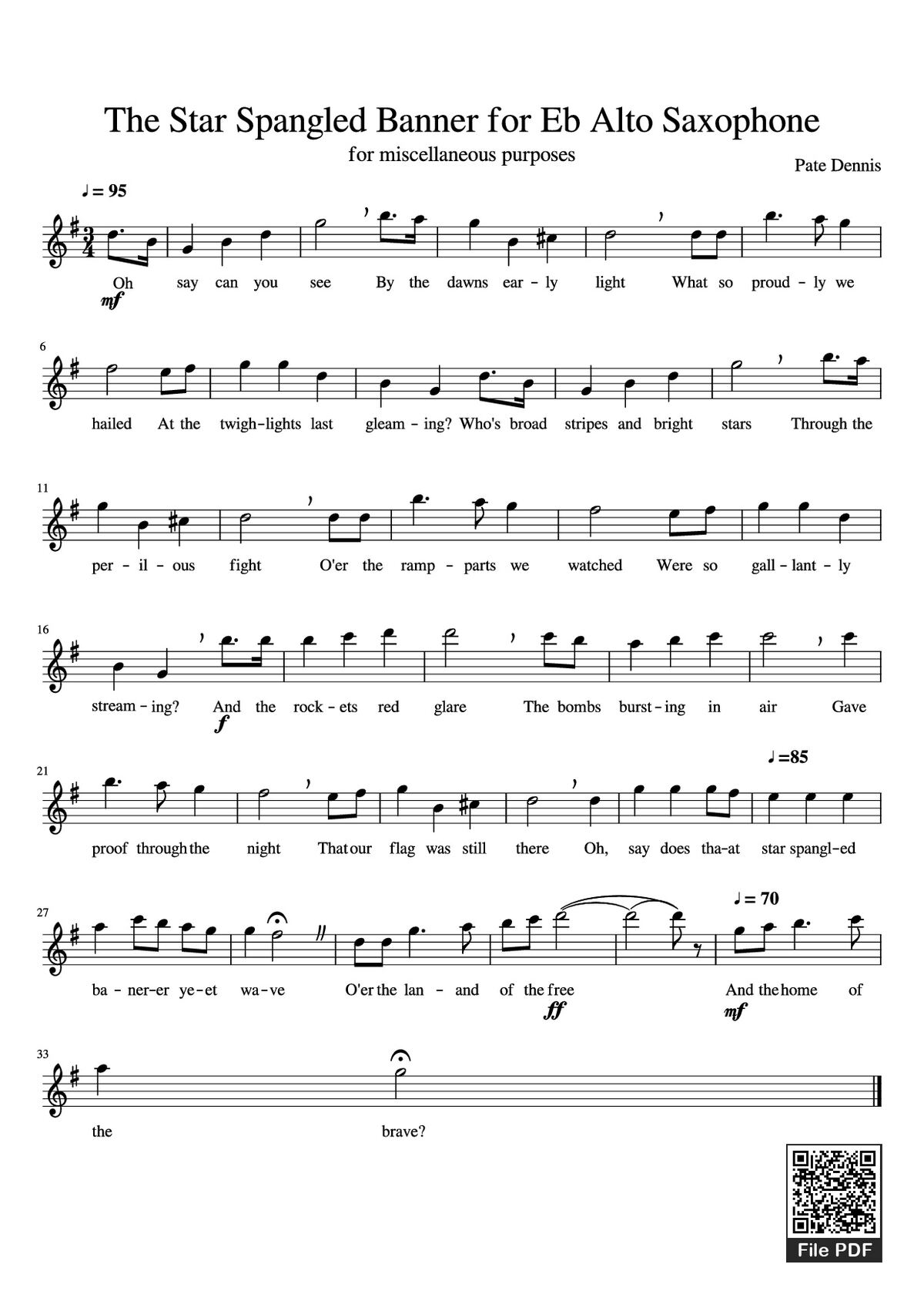 Download and print in PDF or MIDI free sheet music of The Star Spangled Banner - John Stafford Smith for The Star Spangled Banner by John Stafford Smith arranged by PateDennis33 for Saxophone alto (Solo)