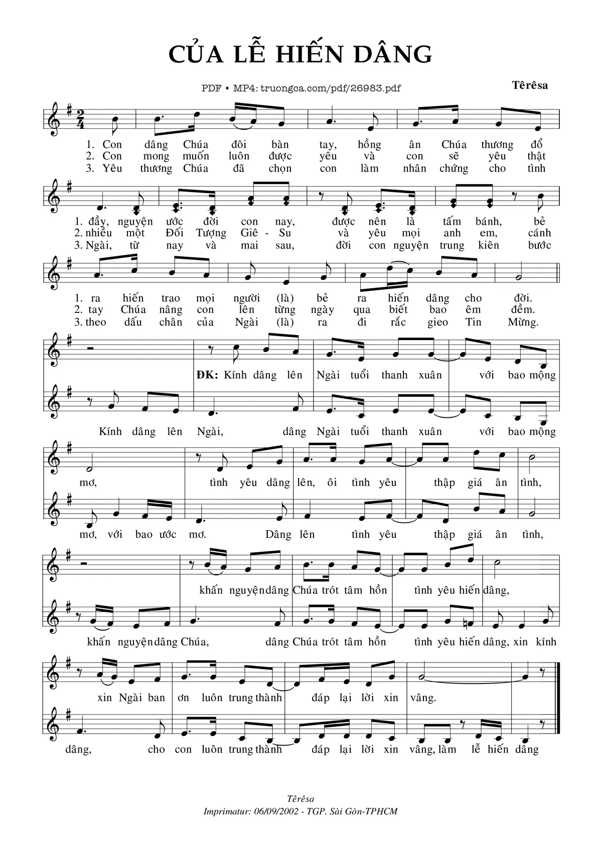 Têrêsa Con dâng Chúa đôi bàn tay hồng ân Chúa thương đổ đầy [PDF] [Sheet] [Lời H.A] [Mp4/Midi]