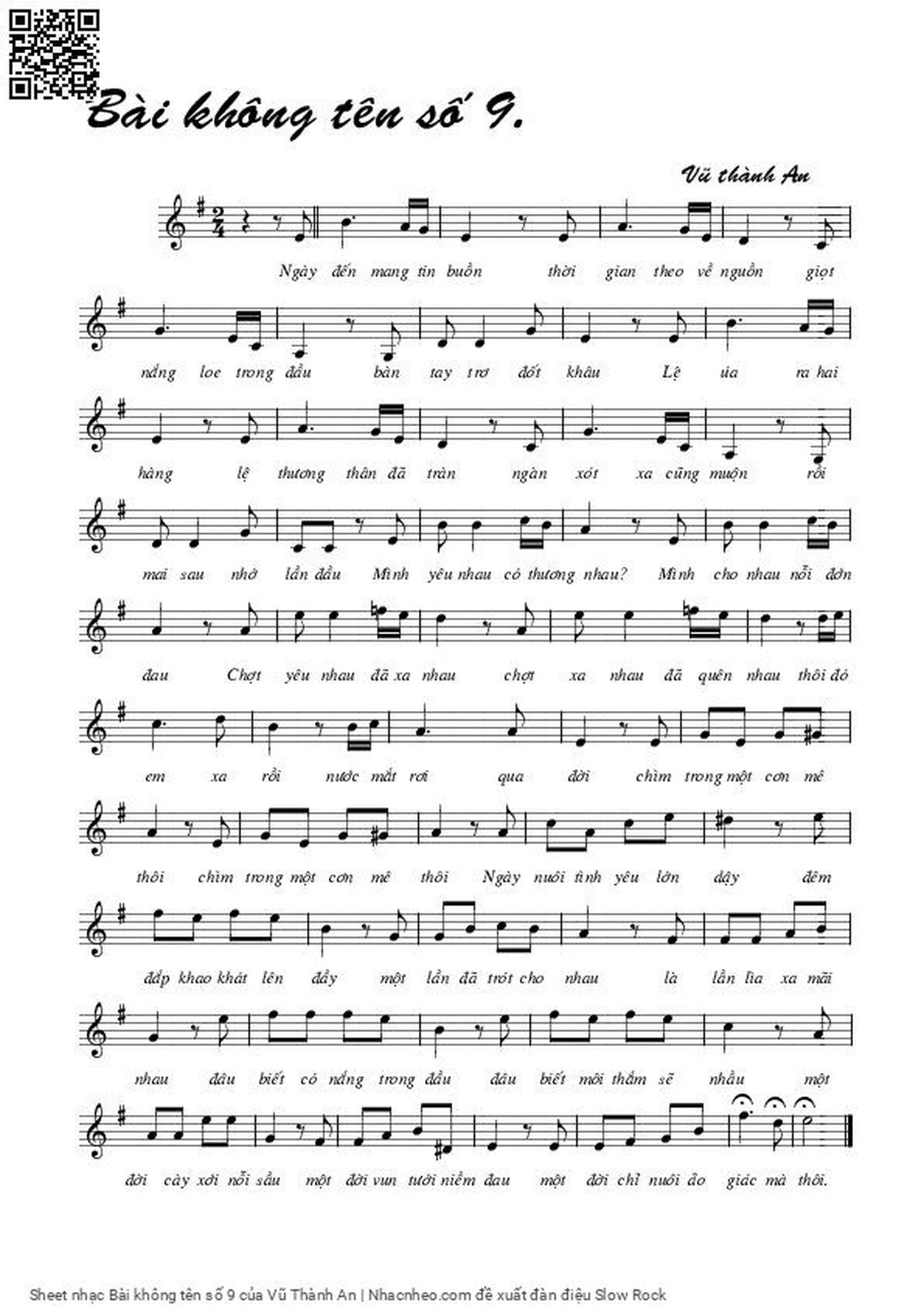 Phần nghe hát Bài không tên số 9 (Vũ Thành An) được nhúng từ Youtube, Musescore hoặc link ngoài và chịu sự kiểm soát bản quyền của bên thứ ba đó, vì vậy có thể bị xóa hoặc chèn quảng cáo bất kỳ lúc nào. Nếu bạn không nghe - xem được ca sĩ hát tức là đã bị Youtube hoặc Musescore kiểm soát.