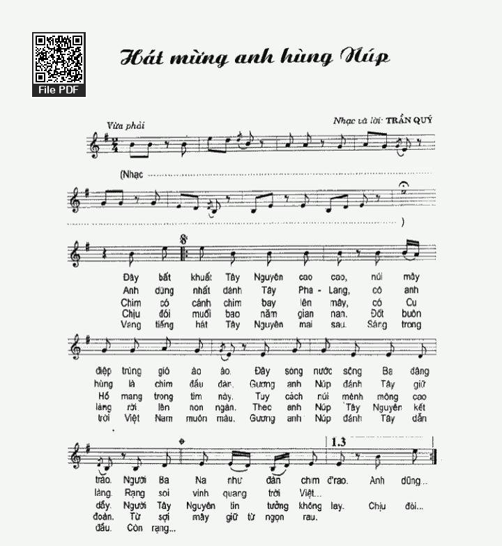 Sheet nhạc có nốt Hát Mừng Anh Hùng Núp của nhạc sĩ Trần Quý và file PDF nốt nhạc đăng lên đây nhằm giúp các bạn xướng âm cho đúng nốt và hát thêm hay, chỉ mang tính chất tham khảo, không có mục đích thương mại. Bản quyền thuộc về tác giả và tổ chức nắm bản quyền, Truongca.com không giữ bất kỳ bản quyền của nội dung nào cả. Các bạn có thể tải về bản PDF chất lượng cao, gồm khuông nhạc có nốt với đường link file PDF bên trên.