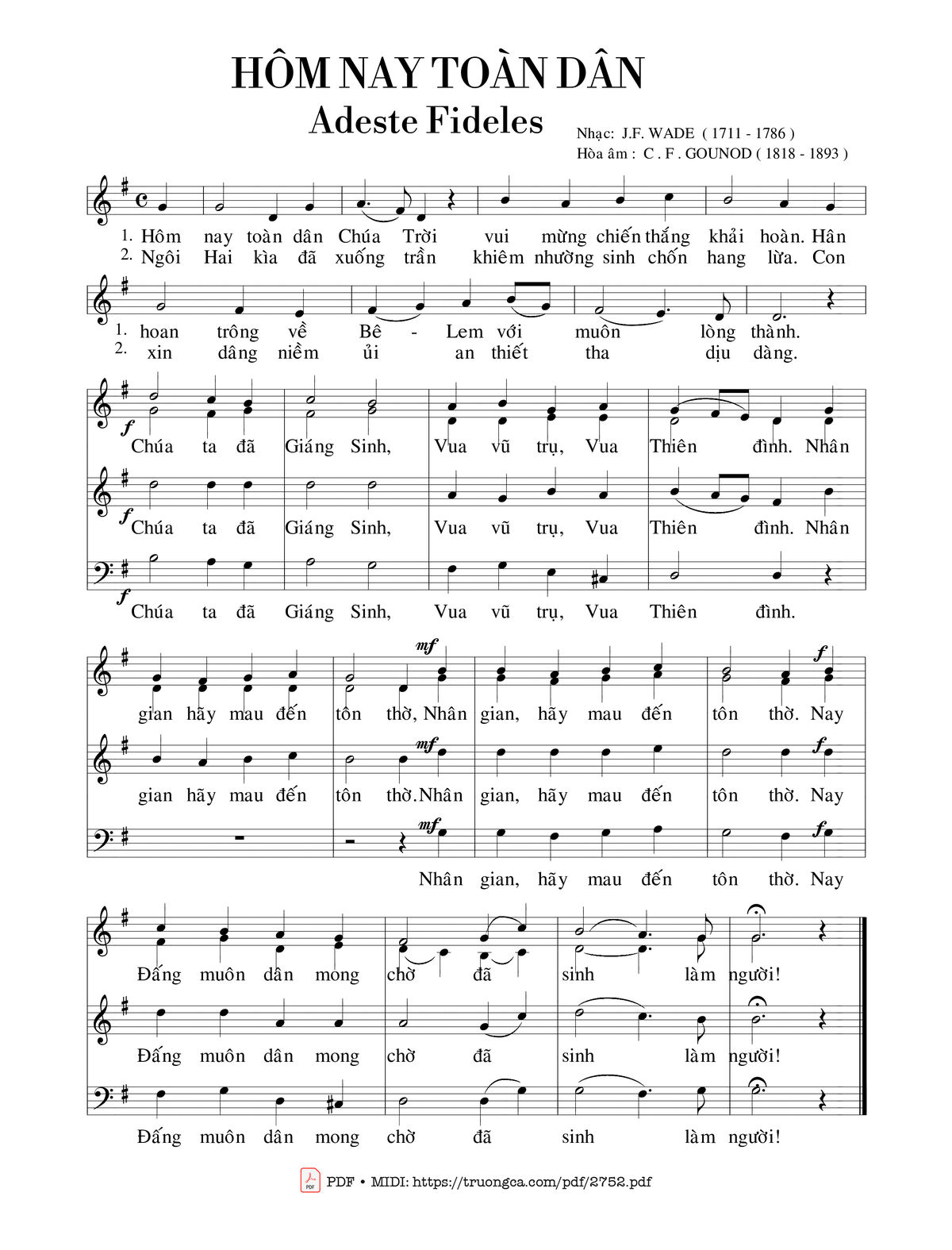 Phần nghe hát Hôm nay toàn dân (J.F.Wade) được nhúng từ Youtube, Musescore hoặc link ngoài và chịu sự kiểm soát bản quyền của bên thứ ba đó, vì vậy có thể bị xóa hoặc chèn quảng cáo bất kỳ lúc nào. Nếu bạn không nghe - xem được ca sĩ hát tức là đã bị Youtube hoặc Musescore kiểm soát.