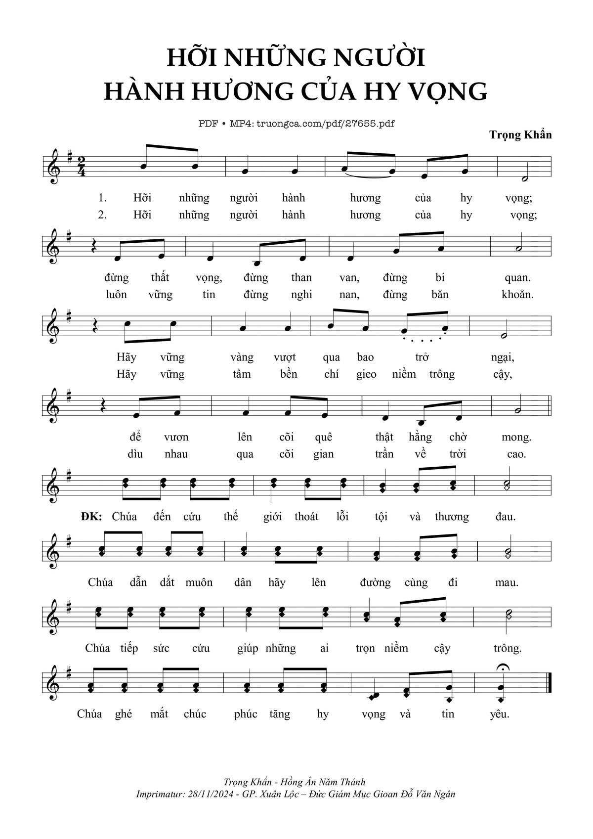 1) Hỡi những người hành hương của hy vọng, đừng thất vọng, đừng than van, đừng bi quan. Hãy vững vàng vượt qua bao trở ngại, để vươn lên cõi quê thật hằng chờ mong.