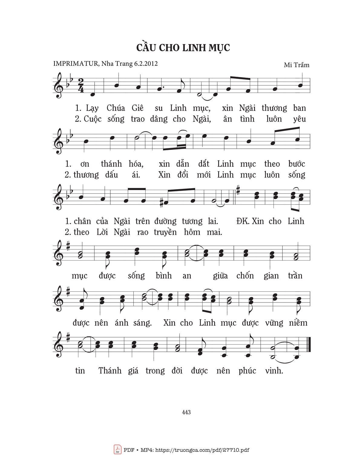 Điệp khúc. Xin cho linh mục được sống bình an. Giữa chốn gian trần được nên ánh sáng. Xin cho linh mục được vững niềm tin. Thánh giá trong đời được nên phúc vinh