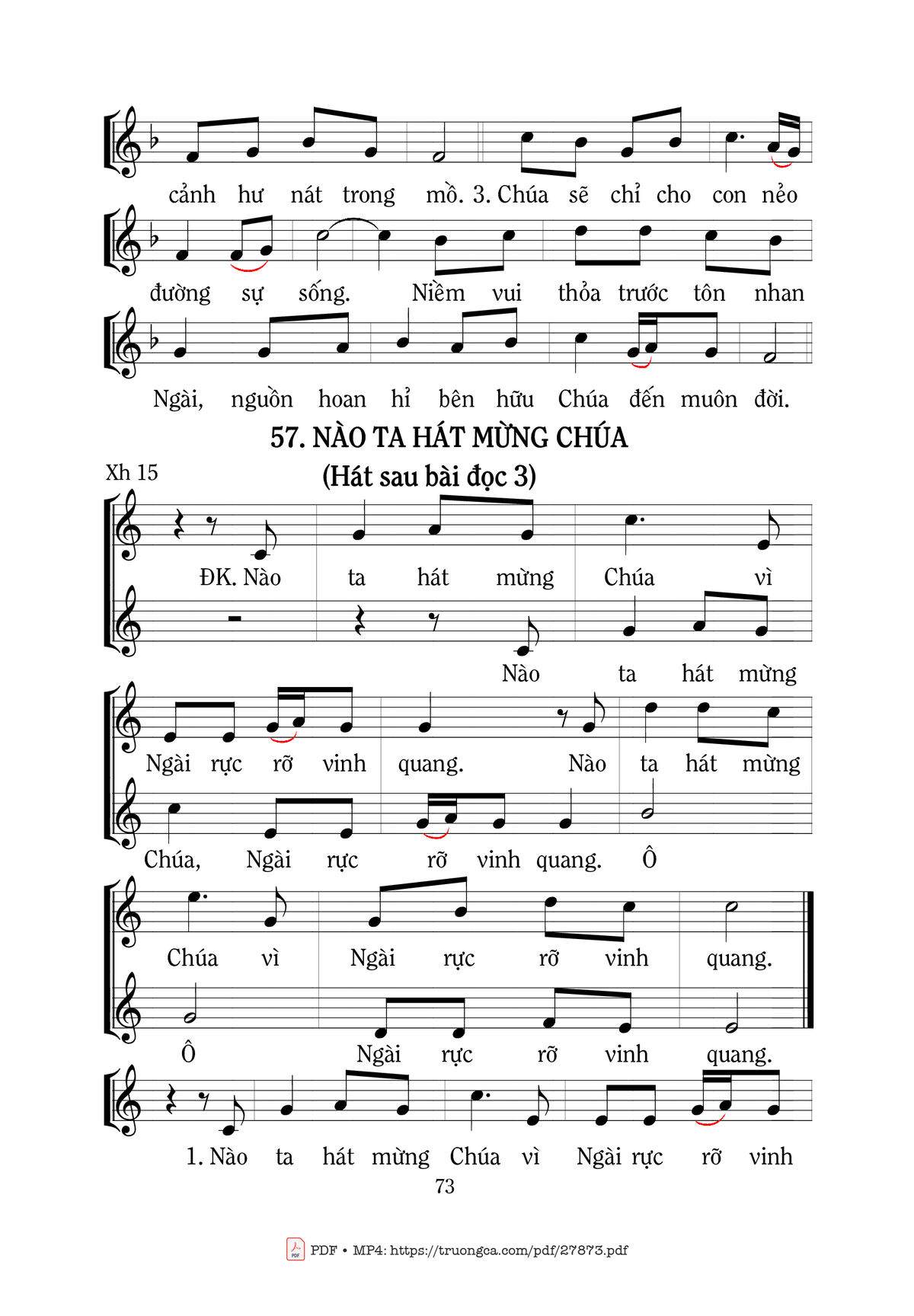 Điệp khúc. Nào ta hát mừng Chúa vì Ngài rực rỡ vinh quang. Nào ta hát mừng Chúa vì Ngài rực rỡ vinh quang.